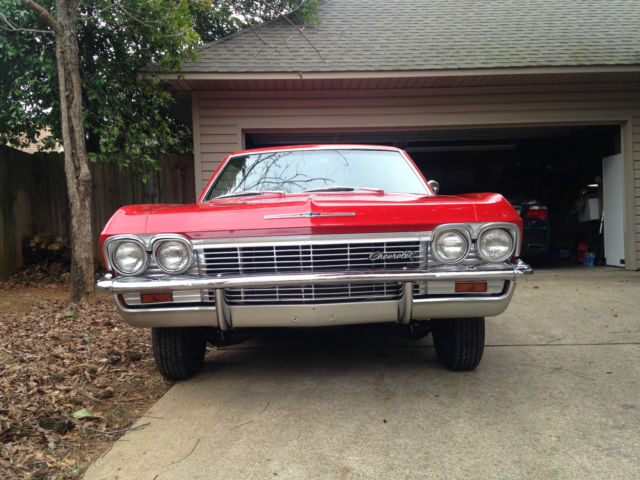 I am selling my 1965 Chevrolet Biscayne along with some other cars I have collected and restored. This is a rust free car and has been completely redone. Everything is virtually new such as motor, transmission, brakes, brake lines, radiator, interior including new headliner, door panels, seats, weatherstripping, carpet, window fuzzies, all door and window handles. All exterior trim including emblems, door handles, bumpers, etc. has been replaced. New tires and wheels, new exhaust system, front window and the list goes on. Car has new floor pans front and rear. The engine is a new 350 with a mild cam. Should push around 350 hp. As you can see it has 427 emblem on the from fenders strictly for show. Off course you can get a crate engine and have the engine of your choice. This car can be driven cross country and have no problems as everything is new. The paint is corvette torch red and is show quality as you can see from the pictures. As you can see there are two sets of tire and wheels and the new owner can pick which set they would like. They are both new. I am not interested in trades as I am liquidating all of my cars because of my age. Feel free to call or text and I will answer any questions you will have. This will probably be the only Biscayne you will see for sale as there are very few of these cars left. Hope it goes to a good family that will enjoy it. Tim 903-216-4376 See other items for other cars for sale.