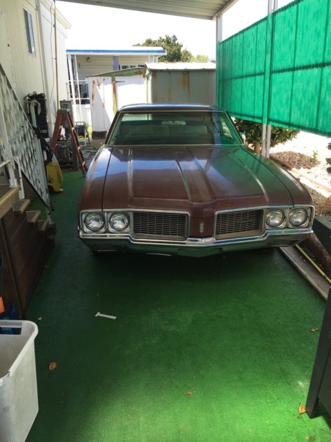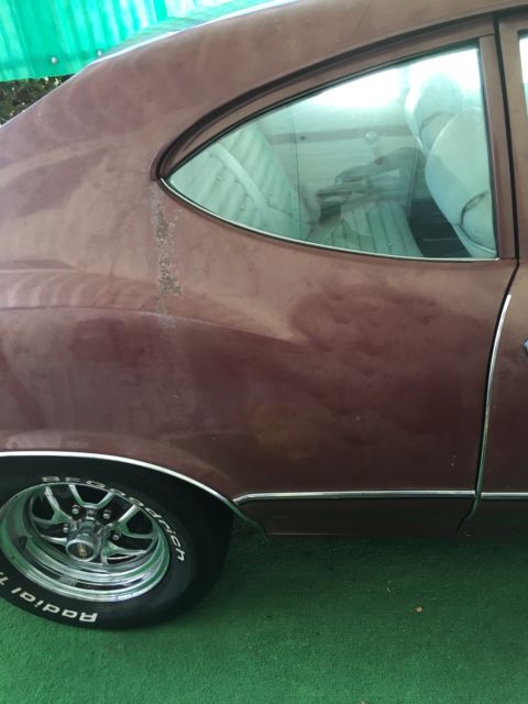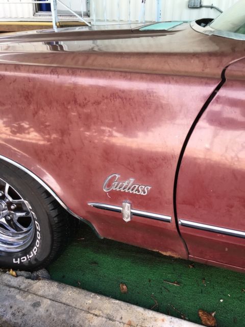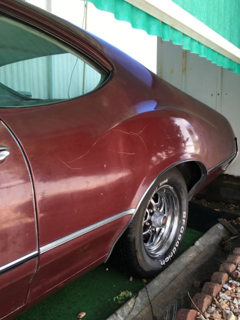 1970 Oldsmobile Cutlass S Fastback 146,974 original miles 350 w/ Rocket tranny The car is all original (even have original AC unit for it), burgundy in color with white interior and black dash. Overall the car is in great condition for the year and best of all it's a complete running car!! The paint is oxidized on the hood, roof and trunk. There is a small dent on the rear passenger side quarter panel near the trunk and the windshield is cracked (someone shot it with a bb gun while it was in my driveway). The floor boards and trunk are both clear of rust. There is minimal rust behind the front tires on both front quarter panels. The interior has the rip on the passenger seat (as seen in the photo) and the driver's side floorboard carpet is starting to rip. Other then that the dash and remainder of the interior is in great condition. The car is bone stock and has matching numbers on the engine and transmission. There are a few minor problems with the car, the back breaks currently aren't functioning properly. There is either a clog somewhere in the break lines or the master cylinder may need to be replaced. There is also something going on with the electrical; when the headlights are on one of the blinkers wont function properly but when the headlights are off the blinker works fine. Body is in good shape, the roof has minor rippling along the outer edges; other then that I mentioned the dent and windshield above. Other then what I've listed above the car runs and fires right up. Please only serious calls only since I've listed everything about the car. Here are a few pictures of the car. If you're interested in the car let me know and I can send you more photos. Thanks 1965, 1966, 1967, 1968, 1969, 1970, 1971, 1972, Chevelle, GTO, Grand Sport, Nova, Camaro, muscle car, classic, hot rod, rat rod