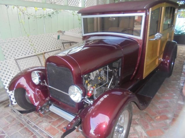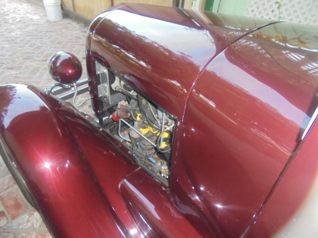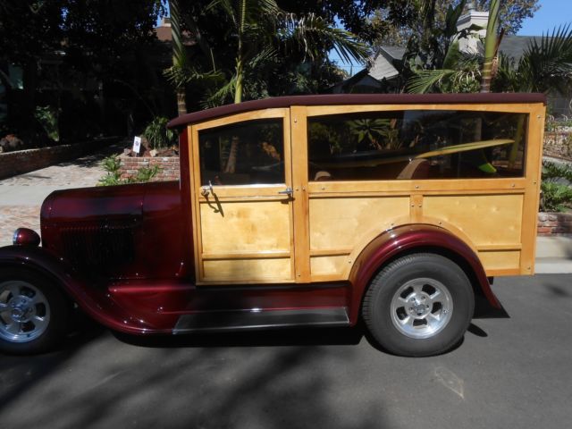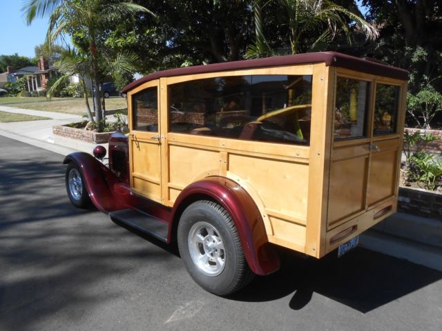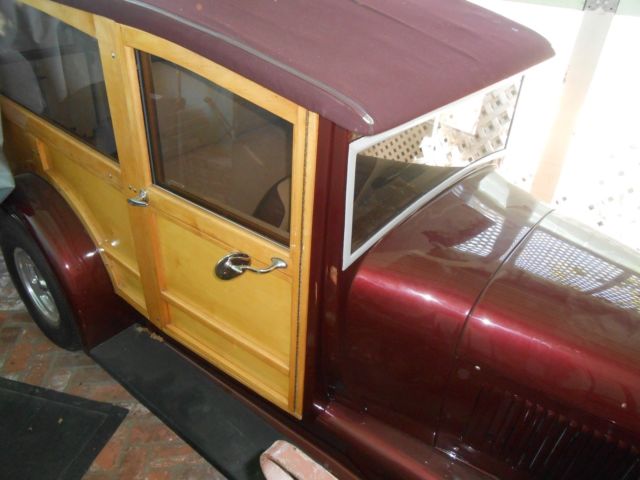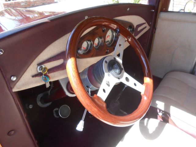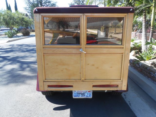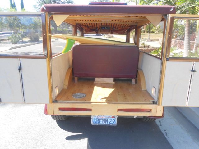 The unique body is fashioned around a welded tubular steel skeleton frame and skinned in Bird's eye maple...the workmanship and craftsmanship is extraordinary!....All of the doors, the windows and all the mechanisms are hand-built....each door is hung with piano hinge design and the openings of the door frames are steel to prevent sag and rattles....the floors in the rear are hardwood, the trim pieces include ash, maple, cherry and walnut woods. There is a custom wood steering wheel on the tilt column and a very nice AM/FM/CD multi-speaker sound system...the taillights are frenched in wood and the stance is enhanced by staggered height radial tires on billet wheels. The top is finished with material used for high-end boat covers...the glass is lightly smoke tinted, the upholstery is burgundy vinyl and a light tweed.. the carpet is burgundy as well ......finally, the body is shot with an outrageous deep metallic burgundy...the cowl, hood, radiator surround and running boards are all metal-the front and rear fenders are fiberglass...fitment everywhere is excellent......if you are seriously considering a purchase, but need pictures focused on any part of the Woody not adequately represented by the current posted photos, please feel free to request specific shots and we will post them. This represents nearly a 4 year project.....as noted earlier, nearly everything on this Woody is custom.....there is no way to accurately measure the amount of time, effort and design talent it took to create this piece....at this asking price, we are definitely selling at a loss...but we desperately want to honor and respect those veterans who are facing real-life challenges right now in winter conditions and we hope to help who ever we can after the sale..please feel free to ask questions.....the Woody is being sold as is, where is with no warranty of any type written or implied...we can say it runs beautifully strong and drives very nicely and draws a tremendous amount of attention wherever it goes--thank you for your consideration...the Woody has clear title in my name and is currently registered and insured in California...easy freeway access to and we will gladly cooperate with shippers...we have several we have used and can supply their information upon request. Every effort has been made to be absolutely as truthful, honest and transparent as possible...we will never knowingly hide any significant information of any type ...this represents a true labor of love, but the economy and many other factors ultimately help decide a purchase....were it up to simply supply and demand for a truly unique 2 door Woody Wagon street rod, this would be selling for a much higher price...we understand that and have reacted accordingly with this new. lower asking price.
