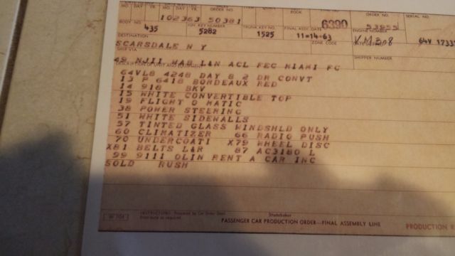 Bourdeau Red with black top and interior. Built in South Bend Indiana. Built with white top but to hard to keep clean. 259 V8 automatic. Power steering. Body restored many years ago and still looks amazing. Solid floors and trunk. Very solid underneath. Much new chrome. Original black interior. New Carpet. Top is brand new. Engine rebuilt recently including recored radiator, hoses, and belts, and runs beautifully. shifts great. New brake system. 4 brand new tires and original spare and jack. Owners manual and production order sheet included. A striking car that is ready to enjoy. New windshield included in sale.small crack in existing windshield. Not much needed to make this one of the best 64 Daytonas out there. Chrome beltline moulding off car and sent to re chroming shop. Should arrive by the 20th of april You may withhold $700.00 of the purchase price till you recieve these items. I will forward to you as soon as they are finished or install if you wish. Priced reasonably. Any questions or offers or partial trades please email or call 574-220-6828. Shipping if needed is at buyers expense. If you are in the area please come see the car. Thank You