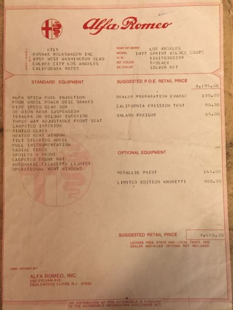 My Alfetta is a non-runner and has been off the road since 1983. I purchased it from the original owner but haven't taken the time to begin the re-commissioning. A limited Mario Andretti addition (number 144 of 150) with original paint and Konis supplied as standard. No sunroof. No A/C.  A current Texas title in my name, I also have a copy of the original California title, and the original owners manual and sales sheet. Rust is showing in the inner front fender wells visible from the engine compartment and a small amount on the rear hatch. There is no rust in the A-pillars, in the floors or sills or around the windshield. Odo is right at 100,000 miles. The engine turns over freely by hand.  Dash is uncracked, front seats need recovering. No major body damage but plenty of medium to small dents; the kind inflicted when a vehicle is stored in confined spaces for long periods of time. The worst of the damage is the passenger door which opens but requires a firm shove to close.  The car needs lots of attention having been off the road for over 30 years but is about as original an Alfetta Coupe as you're apt to find.  Be mindful that the Alfa will need to be towed and can not be driven onto  a trailer.  Any shipping company will want to know this and likely charge more to transport.  Full payment is due within 7 days or pickup of the vehicle whichever comes first.  I'll gladly respond to whatever questions you  have through Ebay, then by email or by phone before close of auction.  Inspections before closing can also be arranged.