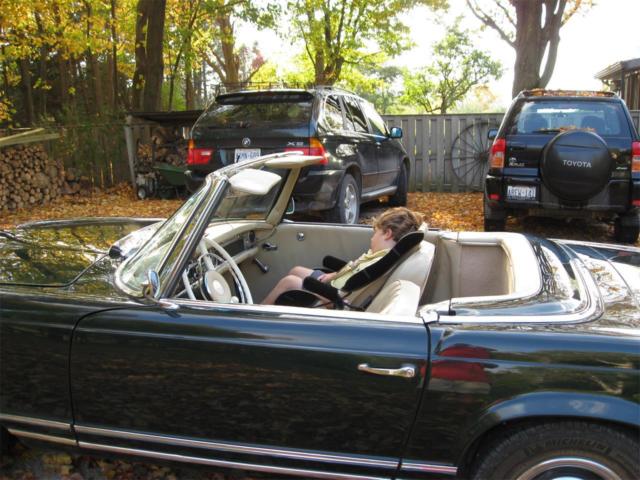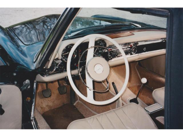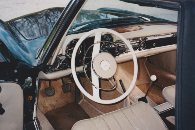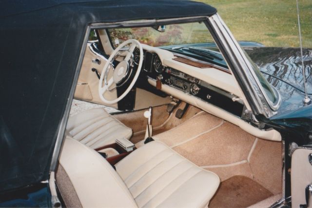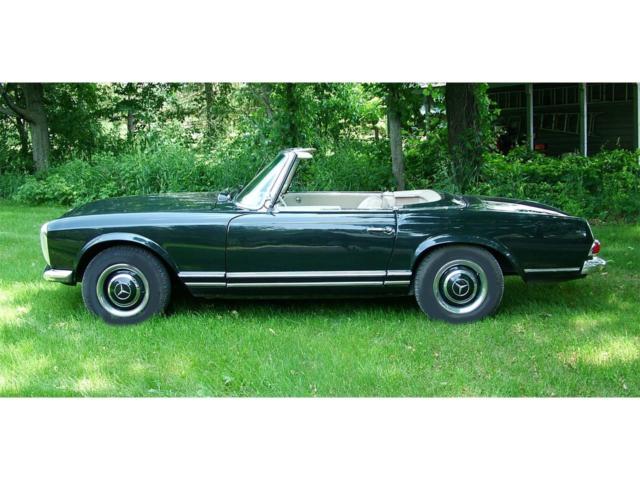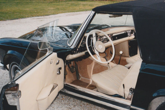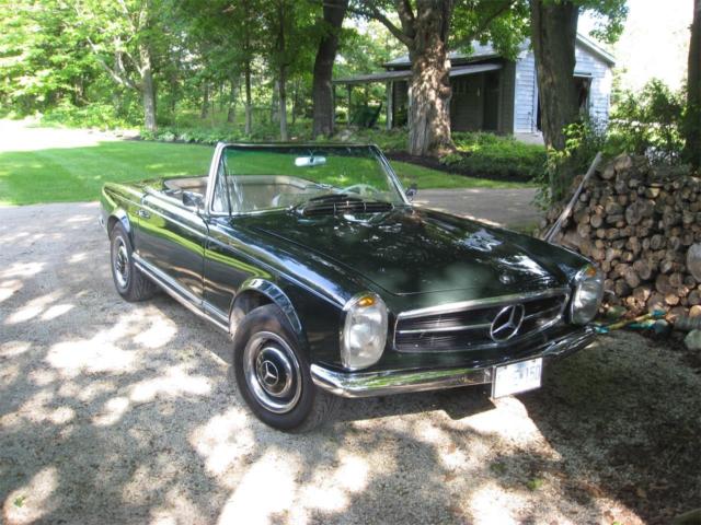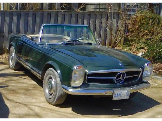 1965 Mercedes-Benz 230SL Convertible/Roadster is shown proudly in Dark Green over Beige leathers. It all starts with the powerful 2.3 Liter 6 Cylinder power plant is the centerpiece of this Class. It offers a Four Speed Manual gearbox that supplies solid shifts. Rich materials, hard woods and beige pile carpeting. Standard features include new front disc breaks with rear drum, leather interior, hard top with garage hoist, soft top, mahogany veneer trim and manual windows. Other standard and optional features included power steering and Mercedes wheel covers that match the exterior finish with exceptional beauty. The car originally came from Sweden so it has the original European styled headlamps and the odometer is calibrated in kilometres. The stainless steel exhaust system makes an attractive burbling sound. I often turn off the radio just to hear the carsâs exquisite rumble. This is not a concourse vehicle, but more aptly described as in good condition. Minor imperfections exist in the paintwork, and interior. The engine has never been touched. The Bosch fuel injection system works perfectly. There is zero body rust and the car is only driven a few hundred kilometres a year during the summer months. As the odometer turns over at 100km, it is impossible to determine the accumulated mileage of the vehicle. Upgrades done about ten years ago cost around $23,000. Bumpers have been re-chromed. New windshield, radiator and tires, The non-original elements of the car are minor and were considered improvements (carpet, exhaust system). Flaws include the Pagoda hard top head liner has not been replaced. The radio needs repair and the gas gauge only reads half-full when actually full. The car is located near the town of Orangeville, Ontario, Canada. We are 45 minutes north of the Toronto International Airport by car. Hagerty Values the car a number 3 at US$56,300 +$4,500 for hardtop +10% for 4-spd = $66,880. Considering the car is located in southern Canada, a more difficult location for American buyers, I am willing to accept a discount at US$49,900.