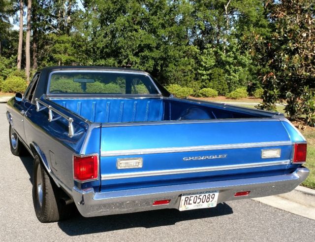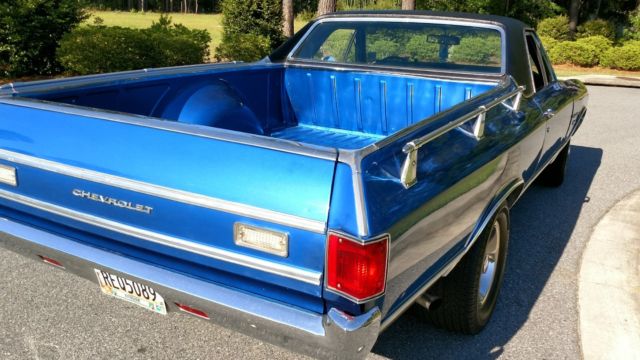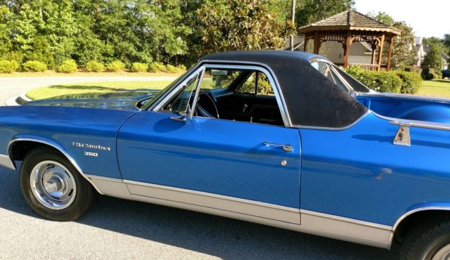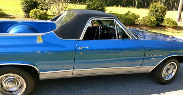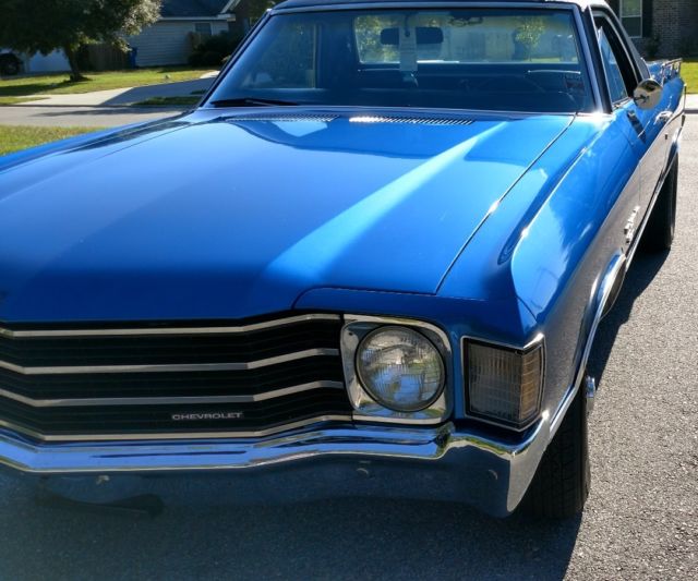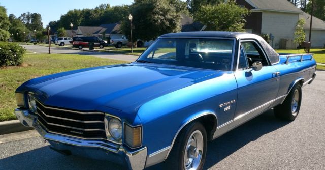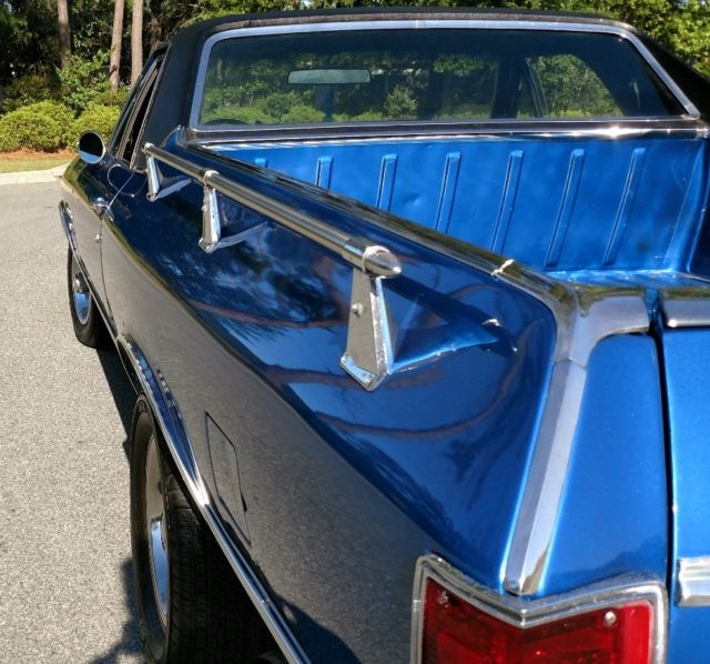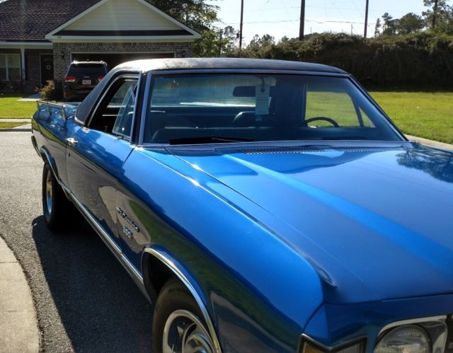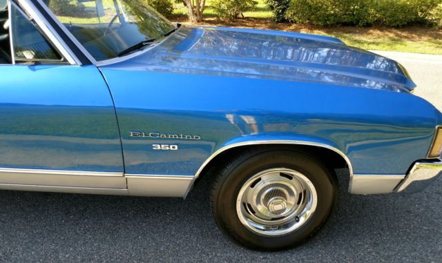 1972 Chevrolet ElCamino originally from central Florida now in Savannah Georgia. She "Ellie" was restored to original condition a few years back and has been driven on weekends since. Drives better than when new. Everything from the brakes to the suspension and motor / trans have been rebuilt. She has 70002 original miles and it shows. Car has in excess of $20,000 in her. All original except for the new stainless steel dual exhaust with Flowmaster 50 series mufflers and headers, and Corvette Rally wheels, and a tape player.(dash not cut) (have original tires/wheels for an extra $300.) Included in the sale is a new quart of the blue paint and a can of Clear coat for the minor spots that may need fixing (very very minimal) ...Just to be fair, there is a scratch at front passenger side near end of fender that could be easily touched up . Also, at one point, the previous owner unbolted the bed floor at the the rear window and put in hidden structure bars so he could haul his Harley without hurting the bed. If you look closely you can see the color is off a little. He did a good job besides and I have pictures of the process. Please shoot me a text at 912 414 1309 if u have any questions. I HAVE A COUPLE VIDEOS AND MORE PICTURES TO TEXT...............CAR IS FOR SALE LOCALLY AND CAN BE REMOVED BEFORE AUCTION END IF IT SELLS. Scott ****** PLEASE DO NOT BID UNLESS YOU PLAN ON BUYING. ASK ANY AND ALL QUESTIONS BEFORE END OF AUCTION OR COME SEE CAR FOR YOURSELF. YOU ARE RESPONSIBLE FOR $300 DEPOSIT IF YOU BACK OUT. NO EXCEPTIONS. ****** I WILL BE MORE THAN HAPPY TO HELP WITH SHIPPING AS LONG AS CAR IS PAID FOR FIRST. MAYBE EVEN DELIVER MYSELF IF ITS REALLY CLOSE.