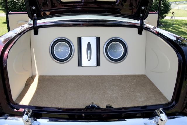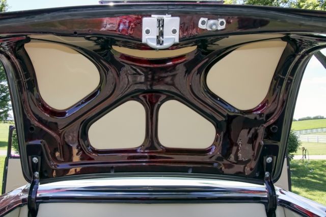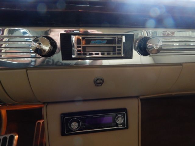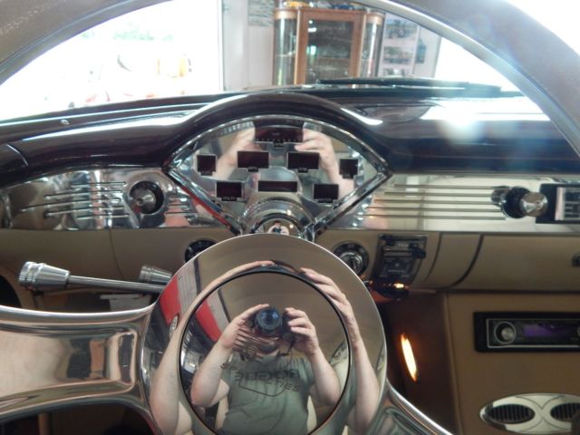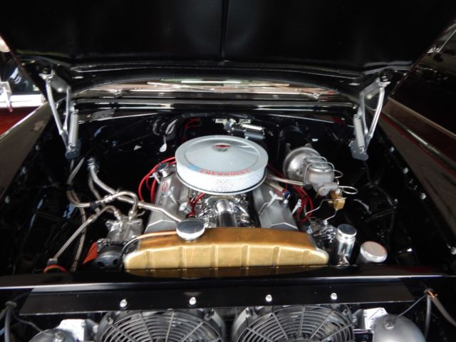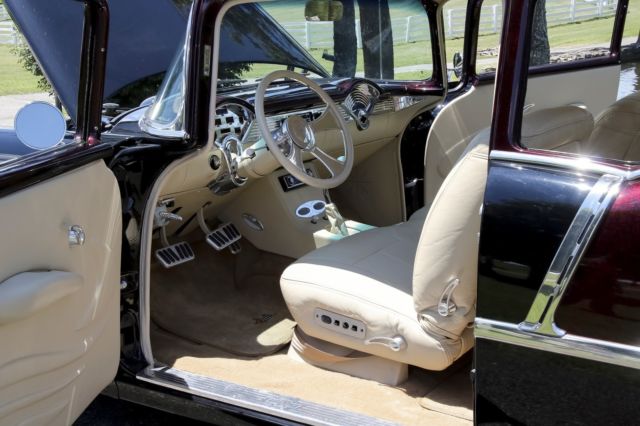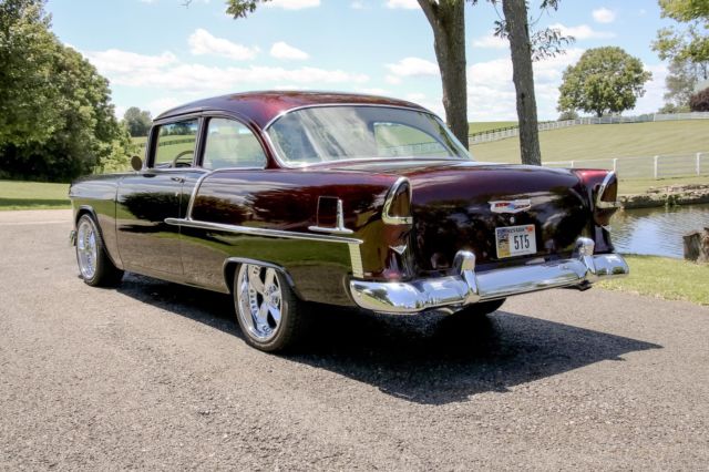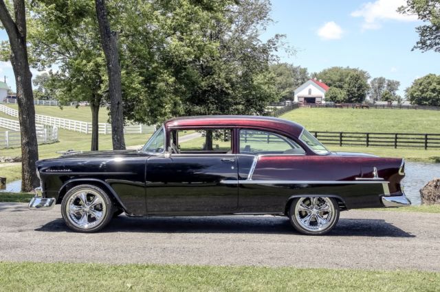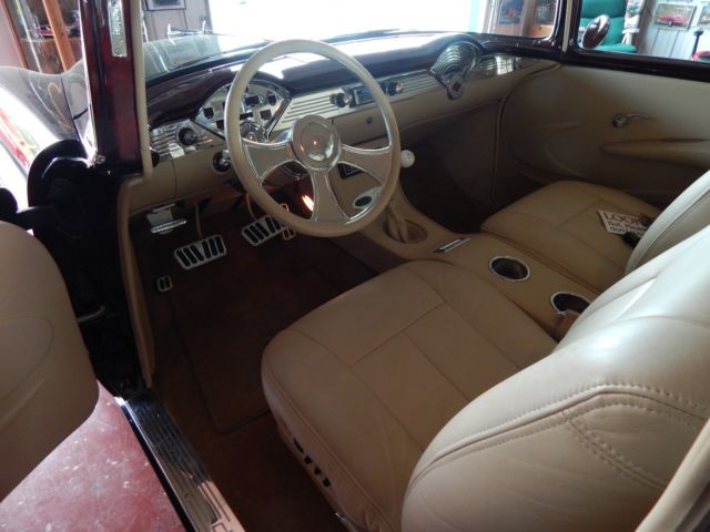 Exterior Beautiful 2-tone paint job, featuring deep black, and Marbleized burgundy and black paint on the roof and rear half of the car. The car sits on 18 inch genuine Foose wheels in mint condition. The two front vent windows have been removed and converted into a single seemless window. Interior Complete custom beige interior, with gorgeous all electric front seats and a custom center console, complemented with cup holders, and a gorgeous billet shifter. Every piece of chrome inside is in mint condition and without haze. The dash pad is painted ther same marble color as the back half of the car, as well as all the door jams and any steel that isnt covered in beige leather or cloth. The dash is completely digital, is very responsive, without lag. All 4 windows are electric, with 4 up/down buttons in the center console, and two for the back windows for the passengers in the back seats. all accessories are billet. A/C is works and is very cold. Mechanical Crate 350 engine TKO 600 5 speed transmission Full 4 wheel disc brake conversion electric fans full stainless long tube headers, custom H-pipe and dual exhaust. Fully functional A/C Motor starts right up and idles extremely smooth and quietly. This 55 Chevrolet is immaculate and has complete attention to detail. the car has resided in a private, climate controlled collection for the last 12 years, and has never seen rain or snow. Don't miss this opportunity to own this marvelous piece of american history.
