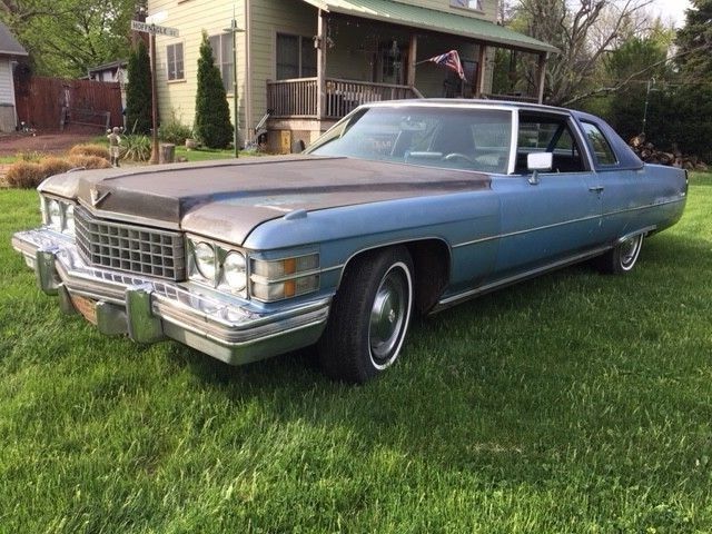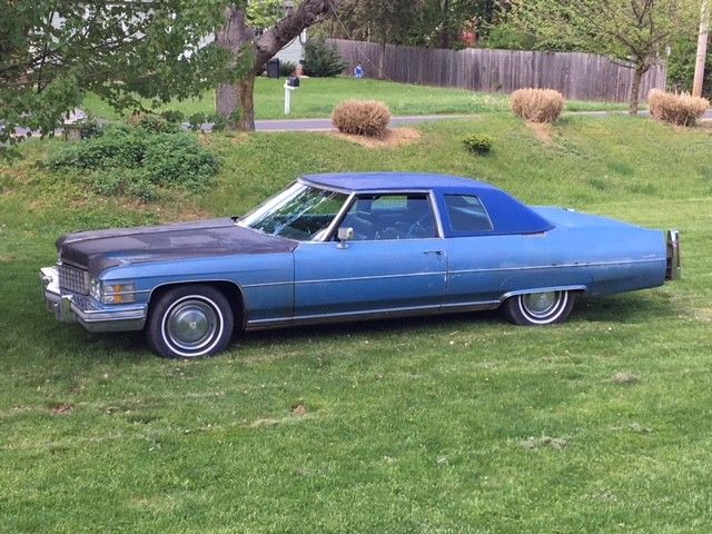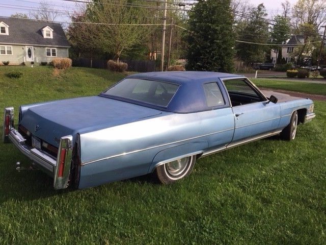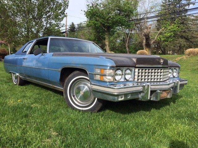 I am 2nd owner of this mechanically sound (inspected and road worthy) ...but in need of cosmetics automobile. Interior is pretty flawless...nice leather seats...perfect dash and headliner. I purchased it from original owner. Hood has (typical of the 70's GM thin paint coat) little paint left as I was beginning to prep it for a paint job. My mechanic recently went over brakes and remarked of very solid under car...frame etc. Gas tank was removed and "acid boiled" and small leak repaired. It was tuned up with new cap, rotor, condenser and plug wires. Has new alternator and windshield wipers. Tires aren't new but have plenty of tread. Needs rear bumper inserts that deteriorated on most of these...they are available by several companies on eBay.Top is presentable but needs new material to make nice. There appears to be no rust underneath material. Trunk is solid (see pictures) jack in place with spare (removed for pictures). I bought it right and have over $4000.00 in it...want to see it find a good home. Low bid starting price with no reserve. I have video of car (available via email) driving at 50mph and I did post to YouTube...under "Good News Garage 1974 Cadillac Coupe de Ville"...runs and drives nice! No car I've had rides as smooth...like you are in your living room. A phone call is best for details...John (610) 662-7748 but will try to answer questions on eBay. $500.00 deposit due within 24 hours of auction ending. Phone call required for any bids without 5 successful Ebay purchase history. Such bids without phone call will be cancelled. Tired of jokers/scammers. I do have car now for sale locally and reserve the right to end auction early... unless someone uses "Buy it Now" prior to local sale.