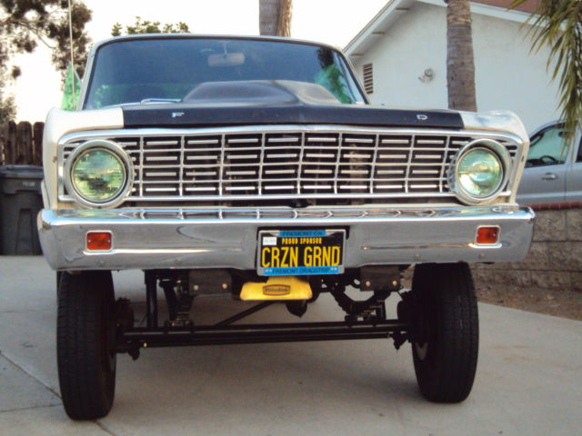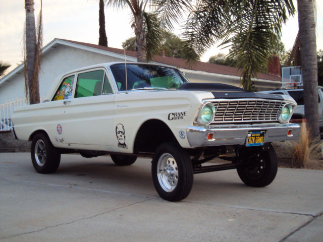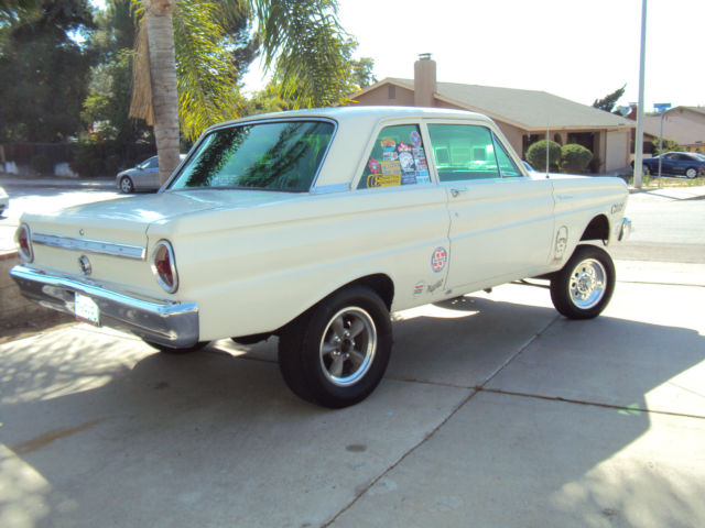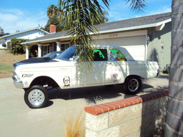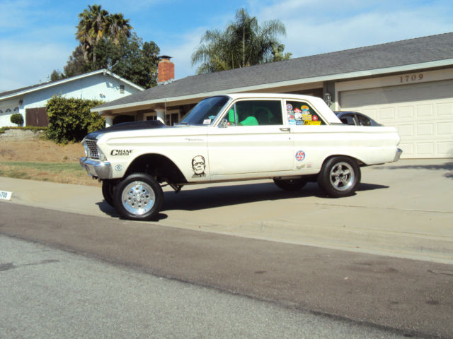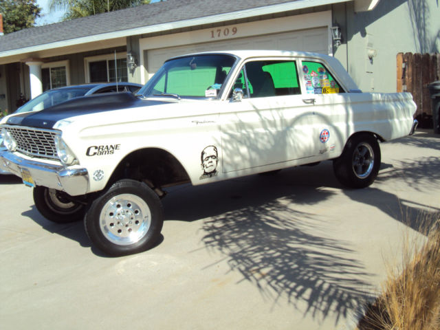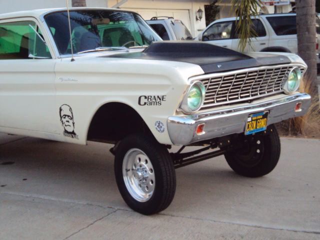 You are bidding on a 1964 Ford Falcon altered wheelbase Gasser, front end moved forward 5in. with a speedway straight axle with leafs done by North County Spring with disc brakes and drum in rear. Skinny 3in rims in front with 15x6in on rear with rare Halibrand mags I do have the center caps for the Halibrands but I keep them off because it looks like the way they ran them in the 60's at Lion's Drag Strip. Motor is a 289 ci. with a nice cam which seems like everybody hears it running they ask if it's a big block that's how great it sounds with the Flow Masters 40 series. Trans is a C4 with a shift kit newly rebuilt and it is a fast Gasser. The car is 54 years old and does have some rust but nothing real bad at all. A few blisters on rear fender well area but like I said nothing bad. Part of the front floors had been patched and done really good, nothing to worry about. The only thing I would get is a carpet kit but the carpet in is good. Lot's of new parts, all lights and turn signals, brakes and wind shield wipers and horn work as they should. Daily driver runs great even down the freeway. Don't really want to sell it, I've been driving Gasser's for at least 40 years and don't really drive anything else. So bid to win, this is a great running and driving street Gasser, it will burn the tires down the street but don't really like doing that, but I know what it will do. Really a attention getter at any car show or even just driving around town, always thumbs up when people see it. The only thing that doesn't go with the car is the front plate, that's for our local cruise nights. I just hand the windows tinted Green by Mr. Tint which is the best around. Also slightly tinted the head lights as well but not enough to where you can't drive at night. Note: The gentleman that bid the highest and won the car in the last auction, he was buying it for his son and the car had too much power for the son and it was just too much car for him. I even mentioned that it would be way too danger est at his age. Cool family but I would rather see them safe in something else. So I had no problem with that.