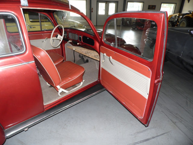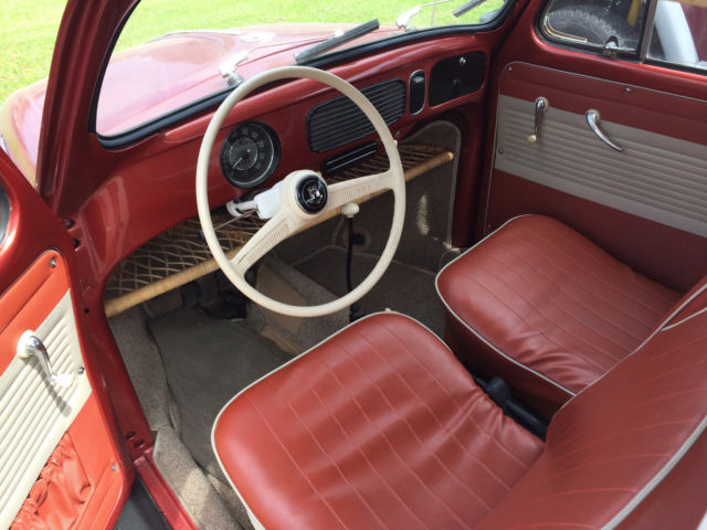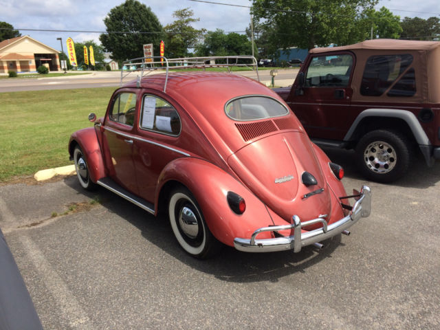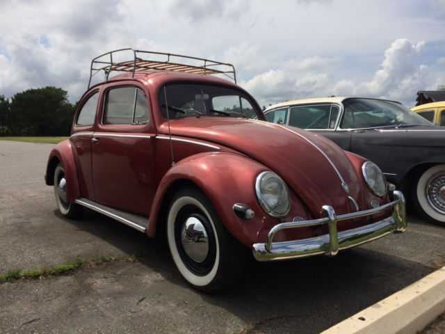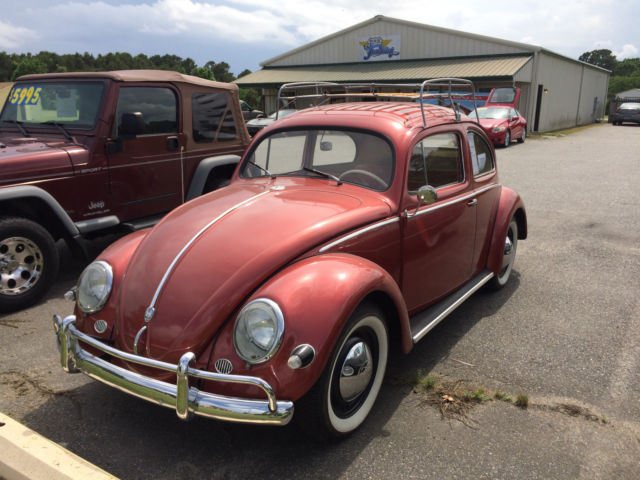 1956 Oval Window Beetle. Nicely restored, rust free car with a beautiful Corral Red paint job and a well sorted out interior. The luggage rack & the Coker Classic white walls are also a nice touch. It is a very nice car, that is turn key ready for cruising. The engine is not a 56 date code but it is the correct style 1200 cc with the oil filler neck as a part of the engine case. The 36 hp engine runs excellent but of course leaks a little oil as they all do. The clutch feels good and the original crash box transmission runs through all the gears as it should, except that it, sometimes, will pop out of 3rd into neutral, but it's only when you let off the throttle to shift into fourth, so it's not too inconvenient, but was an issue I wanted to disclose. The electrical system is still a 6 volt, but with the motor finely tuned, it always cranks up with very little effort. I've put together a photo album here https://flic.kr/s/aHsmeDHgQE The photos should say it all as to the condition of the car, but if you have any other questions, please call me. Also, I am a dealer. Here's my info... Dixie Trading Co. 6592 Caratoke hwy, Grandy NC 27939 NC Dlr # 0075857, so if you're getting funds from a credit union, a bank or collector car lender such as J.J. Best, then I have no problem providing your lender with any information they may need to help the loan process. I am also experienced with working with overseas buyers and have no problem facilitating the title & funds transfers from abroad. I know how the process works and can help you along. My asking price has been reduced from 15,900 to only 13,500 I think it's a great deal, if you do too, then let's get it out of my show room and into your garage... gimmie a call 252-619-8067