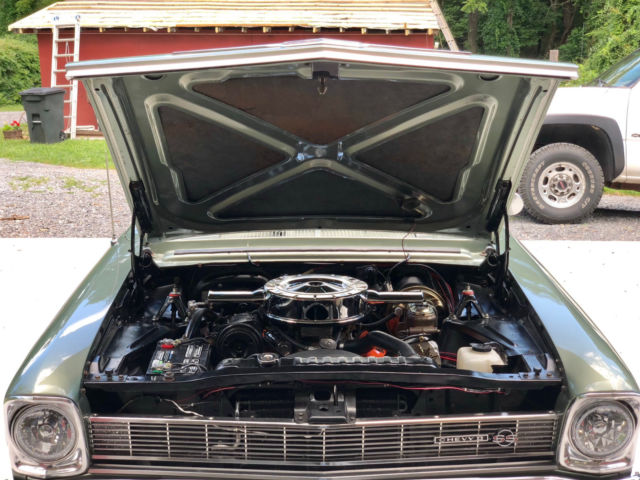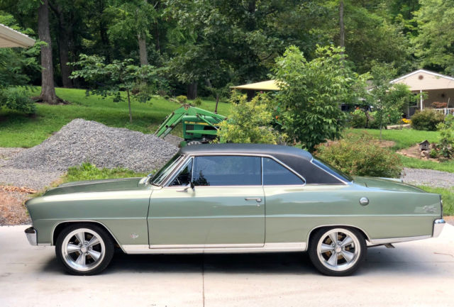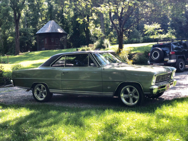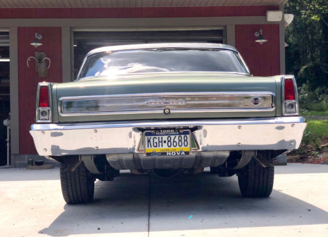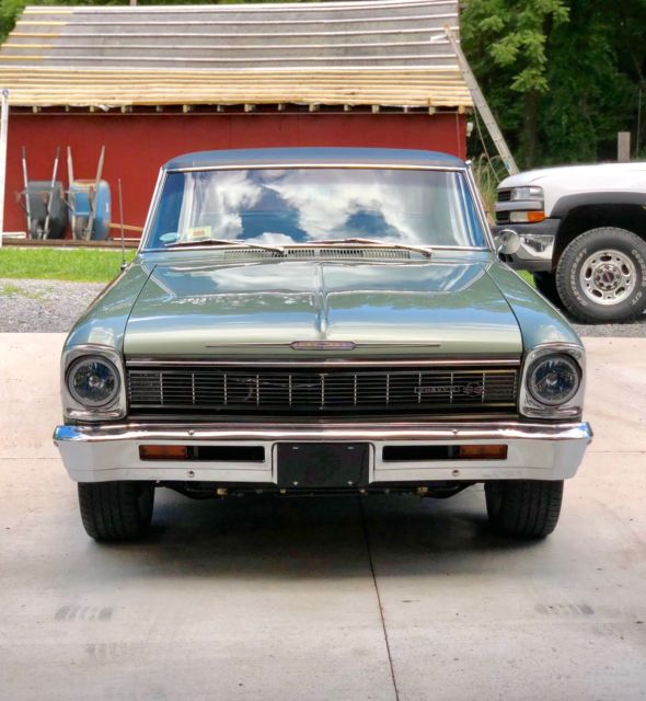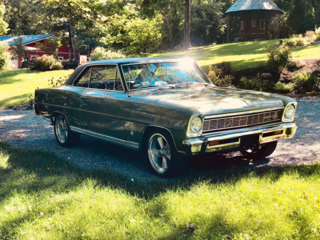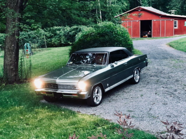 1966 Chevy Nova SS. 8,686 miles on total restoration. Original California car has power steering, all 4 power disk brakes, air conditioning, all newer interior from carpet up to the headliner to seats. All parts new or restored to original. New tinted glass and weatherstripping throughout. Has new 17x7 American Racing wheels with 225/45 tires in back and 215/45 in front. Has a new 327 engine and rebuilt 2004r trans overdrive and new rebuilt 373 Posi 10 bolt rear end. Factory willow green with black vinyl roof. Paint and body is good shape - minor imperfections here and there. Has complete church boys racing front suspension with their coil-over adjustable shocks. Magnaflow duel exhaust exit out back. Everything on this car works, except the AC. It just started blowing warm air and it simply needs recharged with Freon (clutch and compressor work). Very clean car. Handles and run excellent. Solid daily driver or weekend car. This car was in Nova Times Magazine in 2010 (have parts of magazine). Year: 1966 Sound system: AM/FM Radio functional. New Pioneer radio deck mounted in glove-box. 200 Watt Alpine amp under drivers seat. JVC amplified compact sub under passenger seat. (2) 6x9 JL Audio speakers in rear deck. Pair of 3" JL Audio speakers in original dash location. Sounds great! Video that the previous owner took (car has different rims/tires now): https://www.youtube.com/watch?v=ixhymaLN3i0&feature=youtu.be
