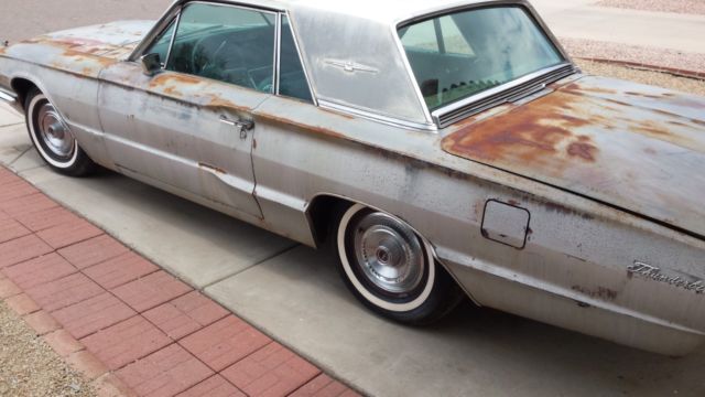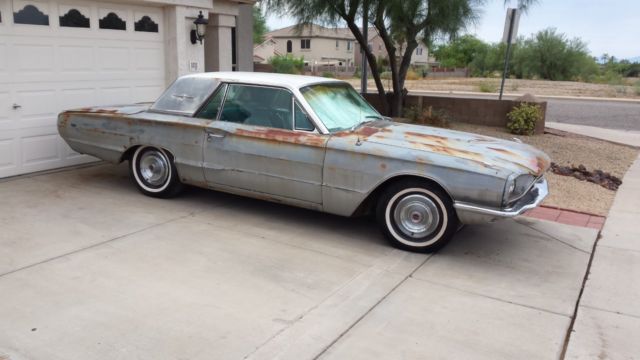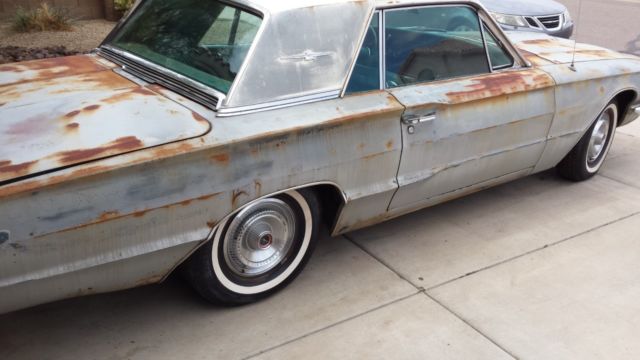 Up for auction is a 1966 Ford Thunderbird Coupe equipped with a 390 ci 4 bbl 315 hp engine,and 3 speed auto trans. I purchased this car from the grandson of the previous owner. This car was well maintained mechanically (see service sheets) the grandfather cared for and drove it until he passed away. The car sat idle in Vancouver Washington for a couple of years until the grandson retrieved it recently. The over all condition is good, the car runs but needs repainting, unless you prefer the patina look. All glass is excellent, the doors open and close smoothly, all windows open and close as they should (manual windows and locks) the chrome is bright and clean, the sequential turn signals work ,the interior is in fair to good condition, (the headliner at the rear needs repair the seam came loose) and there is a small tear on the driver door arm rest) the battery box has rust, along with the right and left edges of the trunk floor. (water pooled in these areas while vehicle was sitting) The floors,front fenders, rear quarters, and the rocker panels are solid. There are no structural rust issues.Please review the service sheets to see the extensive mechanical work the previous owner did to this car, also note the original mileage 32,000 (box A title). The tires,are good with about 80% tread. All service documents,shop manuals, etc.will be included with the car. Vehicle is sold as is, no warranty. Winning bidder is responsible for shipping. Thanks for viewing my auction!