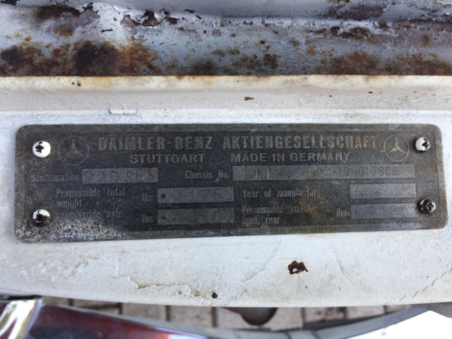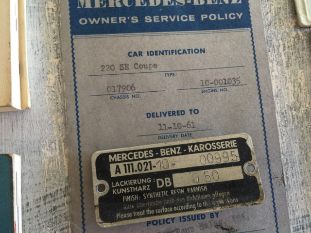 1961 Mercedes-Benz 220SEb Coupe (W111) ULTRA-RARE EARLY PRODUCTION NUMBER.Delivered in New York on November, 10th, 1961!VIN # 111.021-10-017906Karosserie # 111.021-10-00995Exterior paint DB 050 White (weiss).Red leather interior.4-SPEED MANUAL transmission. BECKER Europa radio, Hirschmann antenna.Hand-built early production W111 Coupe with Ponton-era typical characteristics:- VIN # stamped into the plate attached to the top of passenger side inner fender- "Made in Western Germany" plate attached to the driver's side inner fender- cloth headliner- BECKER Europa Ponton/190SL-Style radio100% complete and numbers matching car! The exterior paint is old and faded, it will have to be redone.The front windshield is broken and will have to be replaced.All the chrome trim is included and comes with the car (incl. F+R glass trim).The undercarriage is the original one (never fixed or welded). Frame is solid, floors too. Some areas will require welding. The left side trunk wheel well floor will have to be replaced. Red leather interior is the original factory one. Seats are strong and supportive, with no cracks, cuts or rips at all (seat covers are beautiful, they should be redyed).Carpets should be replaced. Headliner is an early canvas one. It is sagging and it should be replaced.All lights, gauges and horn work the way they should.Radio works, antenna goes up and down properly. The gas tank and fuel lines have been cleaned.The engine turns strongly. It starts with the help of starting fluid.The fuel pump is bad, it should be replaced.Clutch master cylinder and brake master cylinder should be replaced. Original factory books/manuals (even the original radio manuals with imprinted serial numbers!), all 3 original factory keys, jack and spare tire are included and come with the car. When was the last time you saw an EARLY 220SEb Coupe for sale?!... * This vehicle is only 56 years old. It is in need of total restoration.Due to the age sold as-is.$1000 deposit due immediately (non-refundable), balance within the next 3 days via bank wire transfer, cashiers check or cash.This is a WORLDWIDE sale. 904-859-5561*