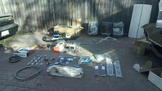 Did I mention I have Spare Parts? We were going All Out on this build so Everything was going to be new, fresh, or updated. I took a overview pic. of the New parts I still have for this build. I have stuff from Moroso. I have stuff from MSD. We were going to go with fuel injection so I have stuff from Holley, and Earls. We had made a smooth firewall, and we were going with a under-dash A/C kit from Vintage Air, I also have weather strip kits for the doors, hood, door locks, and convertible top. Take a look at the stuff and you can also see the disassembly bins we used, parts were tagged and bagged as this build came apart. I still have most of the original interior, with trim, and the convertible top, gauge cluster, steering column, and seats. You can't see it in the pictures but the underbelly is finished and is showroom quality. We took this car to the paint shop as two units, the frame, motor, and suspension, and the entire body on a roticery. The underbelly was painted with a specific theme in mind. The engine is black and red, the frame is black with red bushings and the car was to be silver with black stripes. I had the body shop make the hood smooth on the underside so we could do a novel idea. I wanted the stripes to continue into the engine compartment, down the hood, past the firewall, and under the car. Basically I wanted a mirror image of the outside of the car once you opened the hood. going with our color combinations we chose Black for the engine compartment, and then Red for the stripes. You can just see the stripes as they disappear down the firewall, sadly they did not finish painting the hood. Yes, I had Big Plans for this car. I am really hoping someone will step up and take it to the end of the build.