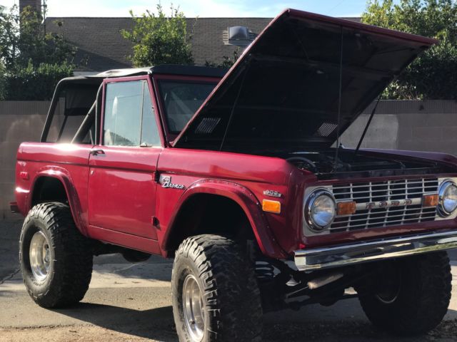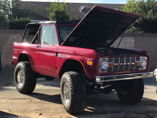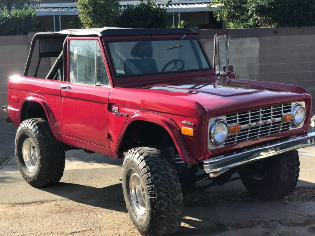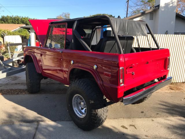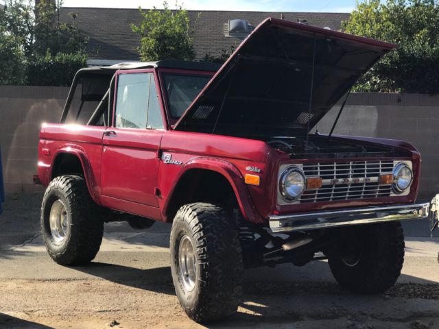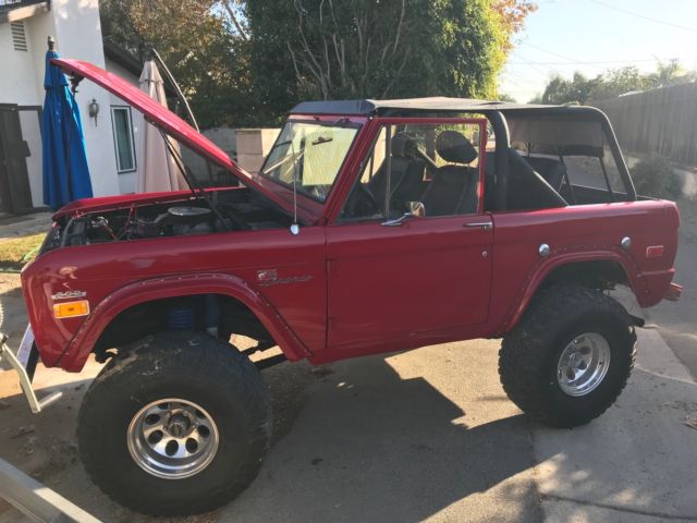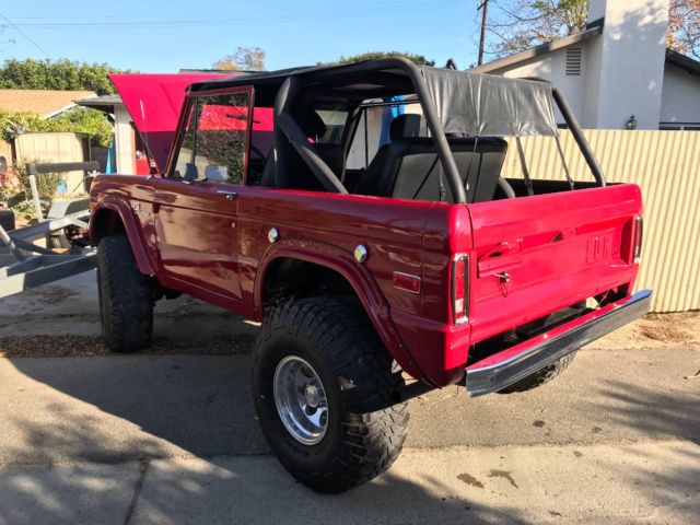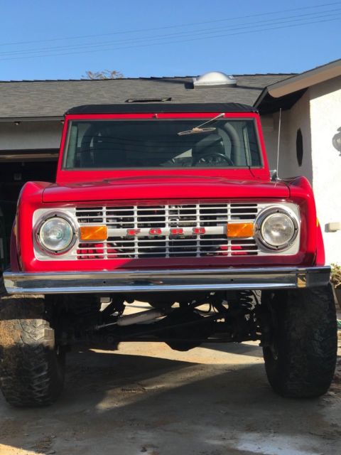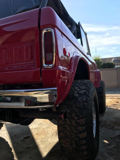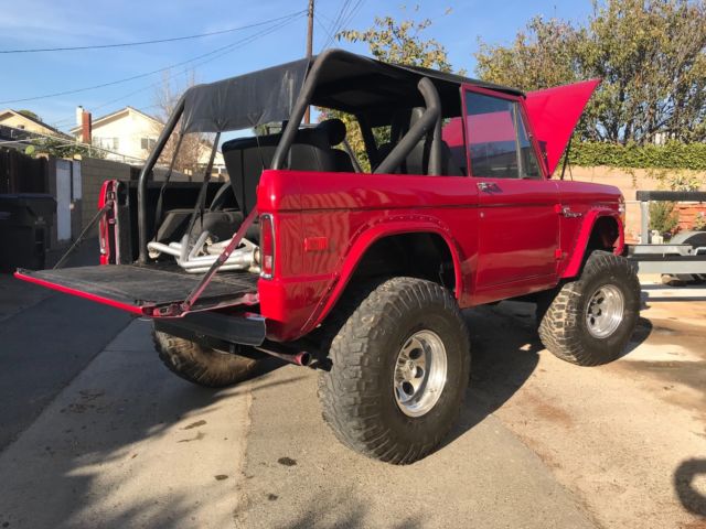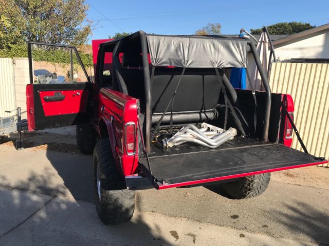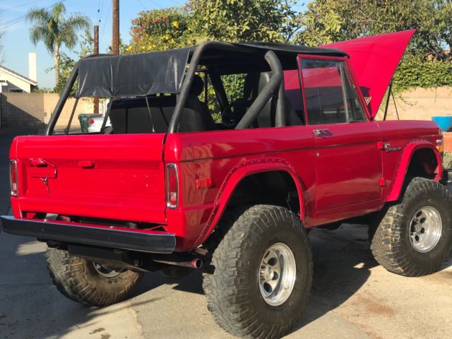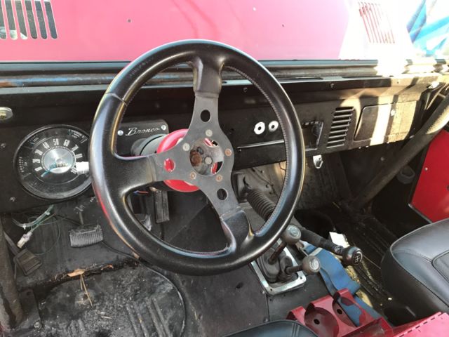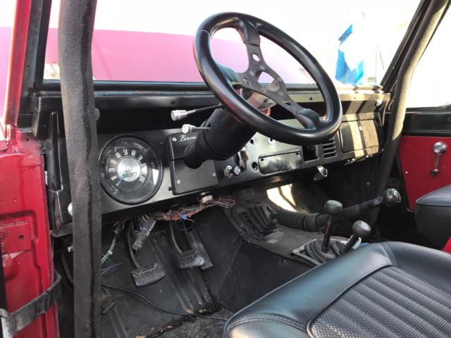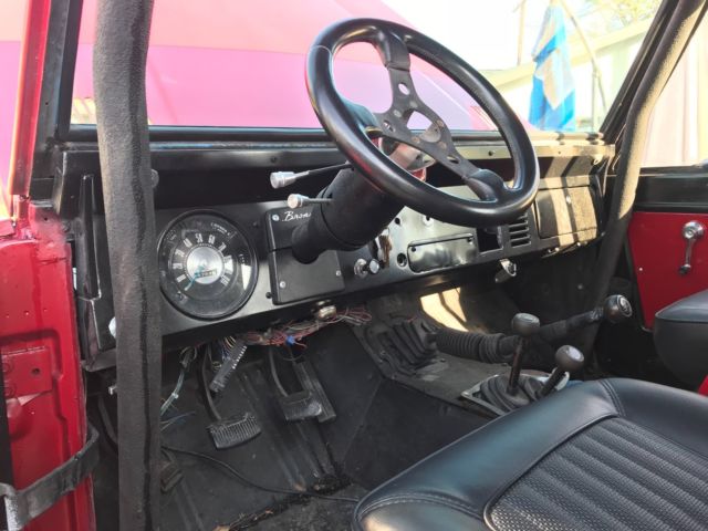 For your Eyes Fresh New Clear Coat - New PU, 2 stage Porsche GTS Carmen Red PPG + 3X Clear Coat Brand New Upholstery! 37.5" Goodyear Wranglers Full cage w/ rear family bars Rhino lined tub Under the Hood Rebuilt 302 V8, 30 over w/ approximately 30K miles since build. Engine purrs on first crank and roars through the streets. Granny 1st gear could pull a Mack truck. Freshly rebuilt Edelbrock 4 barrel carb Brand new Sherman Tank (23 Gallon rear tank) and Brand new Aux tank (12 gallons), with brand new braided fuel lines, new fuel pump, and filters. Brand new alternator New battery MSD Ignition and MSD Distributor Edelbrock intake manifold K&N Air Filter For the Road Power Steering Rebuilt 4-Speed Transmission: New Process 435 w/ granny 1st gear Rebuilt Dana 20 transfer case w/ Wild Horses Twin Stick shifters 5 1/2" James Duff Suspension lift, with spring lift in the rear and no blocks on axle. 37.5" Goodyear Wranglers on black "deadlock" steel wheels Dana 44 w/ Detroit Locker 456 gears Power disk brakes on front axle 9" Rear Axle w/ Detroit Locker, 456 gears Tom Wood drive shafts Drop down pitman arm Adjustable tie rod assembly Inside Brand New Interior Upholstery w/ matching rear seat; Mercedes Benz black leatherette. Fully-adjustable front seats. Tilt steering column Painless wiring harness (previous owner) Custom painted center console (locking) w/ keys; matching upholstery Spare Parts (included @ full reserve) Full Rear tire-hang bumper Full front bull bumper w/ attached winch Full-size spare tire Headers, not yet installed