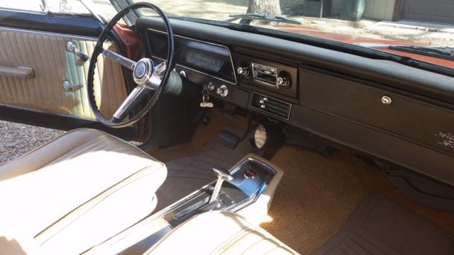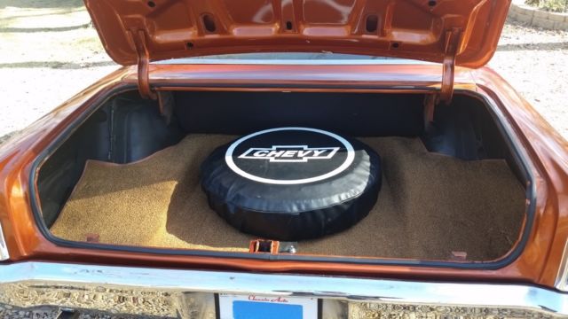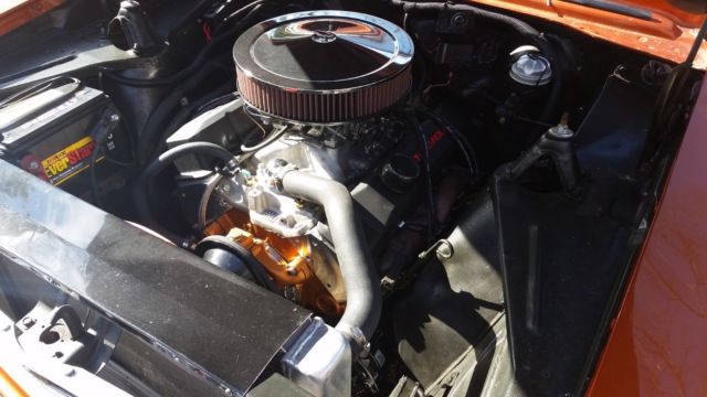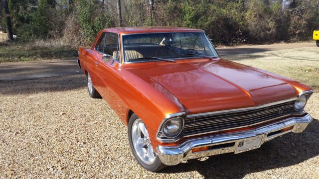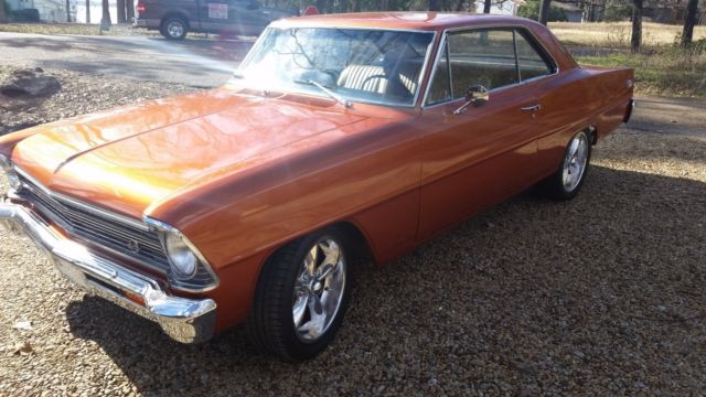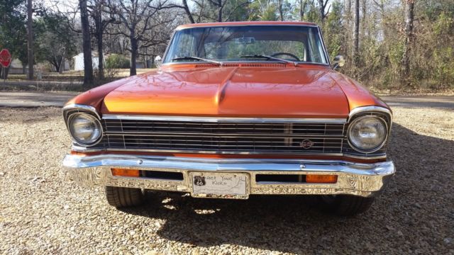 Real Deal Nova SS (VIN# 117) ⦠Born as 6 cyl, Powerglide trans ⦠New 350 SBC built by American Speed in Davenport, IA ⦠NKB 200cc aluminum heads ⦠Comp cam, hyd lifters, roller rockers ⦠TH350 performance auto transmission ⦠Oversized aluminum crossflow radiator, elec fan ⦠Edelbrock Performer aluminum intake and carb ⦠HEI ignition ⦠10 bolt rearend with 3.08 ratio highway gears ⦠All new wiring with American Autowire Highway 22 ⦠17" Streeter Showwheels, recent Goodyear Eagles ⦠Recent brake job and alignment ⦠New carpet throughout including trunk ⦠New Custom Autosound USA-230 stereo & speakers ⦠New gauges and switches ⦠Original SS interior and console with floor shift ⦠New rear shocks A real 1966 Chevy II Nova SS that is mostly original. Rear quarter panels professionally replaced in 2016. Painted Corvette Atomic Orange with gold pearl in 2016. New 350 ci SBC engine bored .030 over, racing pistons and rods, Comp cam, NKB 200 cc aluminum heads with 2.02 & 1.60 valves, Edelbrock Performer intake and 4bbl carb, HEI distributor, new aluminum hi-flow water pump, 160 thermostat, oversized aluminum crossflow radiator with electric fan. New 100amp alternator and battery. TH350 transmission with new filter and fluid service. Recent brake rebuild on drums all around. Manual steering and brakes. New American Autowire harness, new speedometer and dash gauges, new AutoSound USA-230 stereo with front and rear speakers. New carpet including trunk. New Monroe Load-Leveler rear shocks. Recent front end rebuild with alignment. 17" Streeter Showheels with near new Goodyear Eagle radials.Engine has less than 500 miles on it and is estimated at 425hp, 10.5:1 compression. Runs on premium pump gas. TH350 transmission was built in 2016. Car runs great and will only improve as engine gets break-in miles on it. Has never been over 3500 rpm to date.As-is with no warranty. Shipping is responsibility of buyer. Possible delivery in my covered car hauler trailer could be negotiated at extra cost within resonable distance. Please contact me for additional pictures or with any questions.
