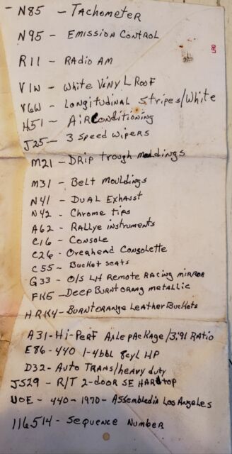 I bought the car 10 years ago knowing it was a very rare low production car. When I bought this car it had a 383 non numbers matching engine and 727 transmission, not sure if its number matching goes with it. The car was partially disassembled but is all there except some trim pieces and the A/C unit under the hood was gone. There is a lot of rust to be fixed so it is going to take a good body man. Front and rear floor pans are gone, firewall and cowl have rust. Passenger rear frame rail is rusty. Front frame rails, torsion bars, cross member, and inner fenders are good. Trunk pans have some rust I would reccomend replacing. The roof skin is gone and needs replaced. A 1970 Challenger parts car also goes with the R/T - SE and it has a good roof. The grill and headlight bezels are in excellent condition.If you have any questions I should be able to answer them. U0E 440-1970 assembled in Los Angeles. High performance axle package 3:91 ratio gear is missing. If you have any questions please call no texts 606-923-2482.