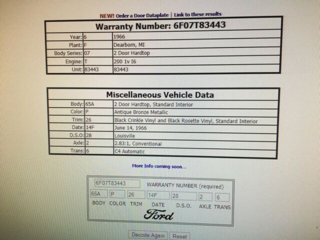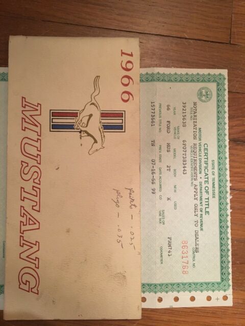 I have a original time capsule 66 Mustang Sprint having been repainted a few years back due to fading. I do have a one owner title in hand and car only has 53,000 original miles and has always been garage kept. After I made the purchase, I found a convertible that I bought and decided to sell the Sprint instead of registering it. The original owner kept this car maintained and did whatever needed along the way to keep it on the road. Car was originally purchased on July 16, 1966 from Stewart-Potts Motors Inc. in Shelbyville Tennessee. The Sprint B package includes chrome breather, chrome oil cap, deluxe style wire hub caps, quarter trim delete, rear seat belts, and center console. Original paint color was matched with Antique Bronze Metallic paint. Car has original motor and tranny, 200 1v I6 and C4 automatic. Car runs and drives great and appears to be rust free. Comes with original owners manual registered to the owner. This is your chance to purchase a rare optioned one owner title car that is turn key and ready for the cruise ins. I just purchase brand new style wheel hub caps that I put on, I still have the original wire caps also. Four23-304-eight475 After owner moving to Chattanooga Tn he lost the original title and had to file for duplicate one which still shows the purchase date.