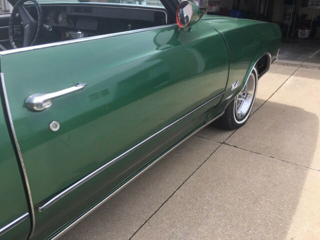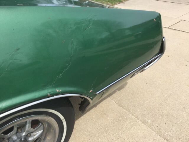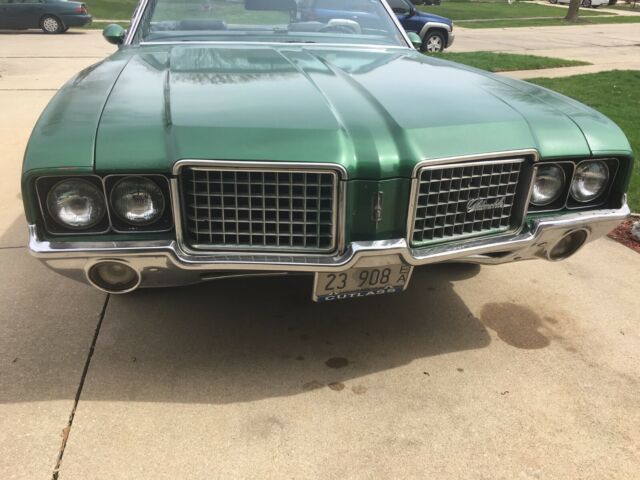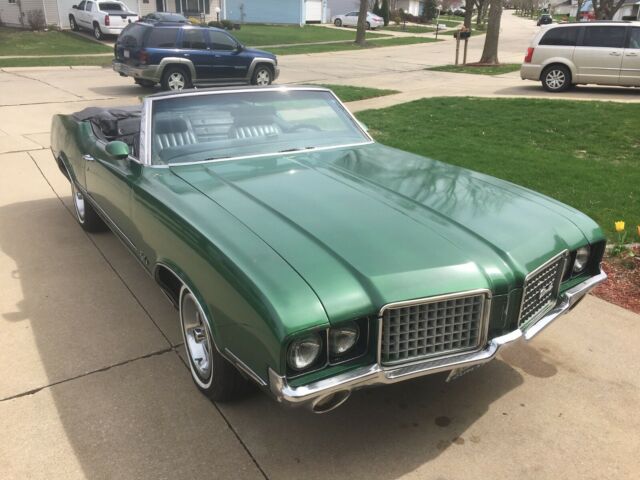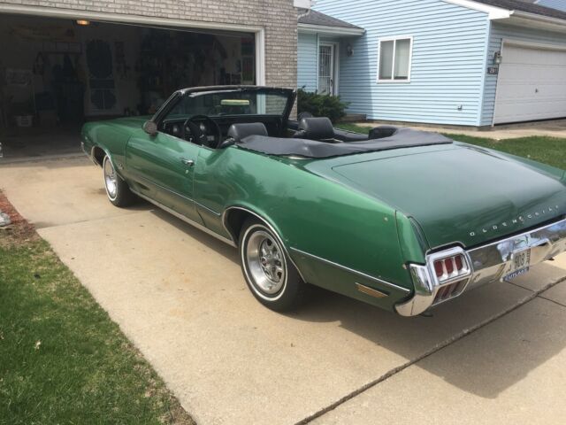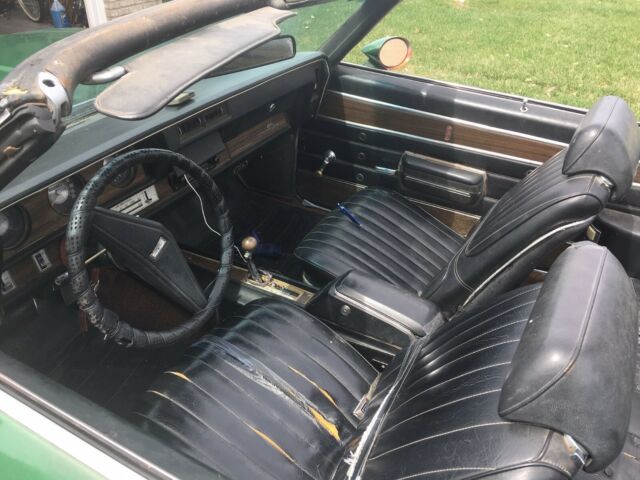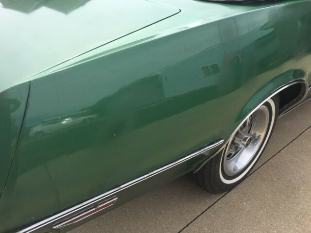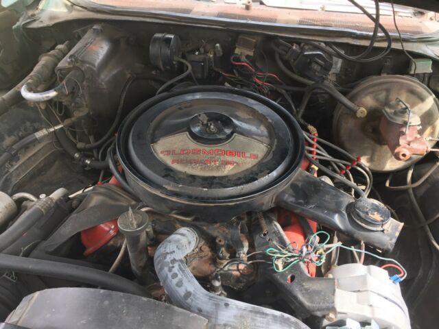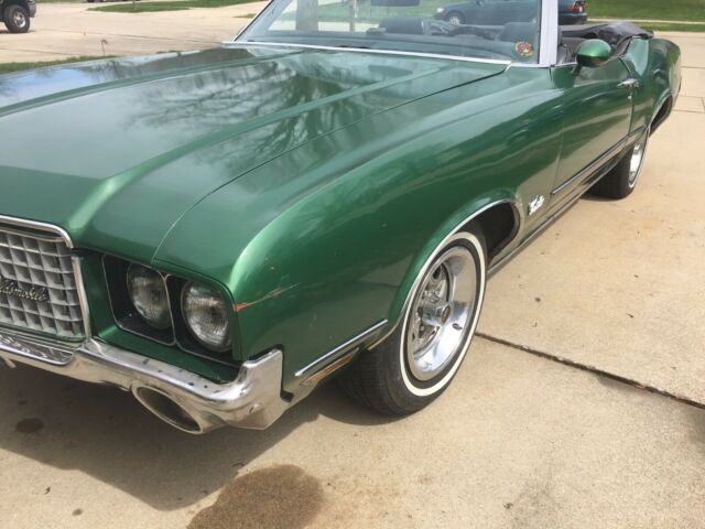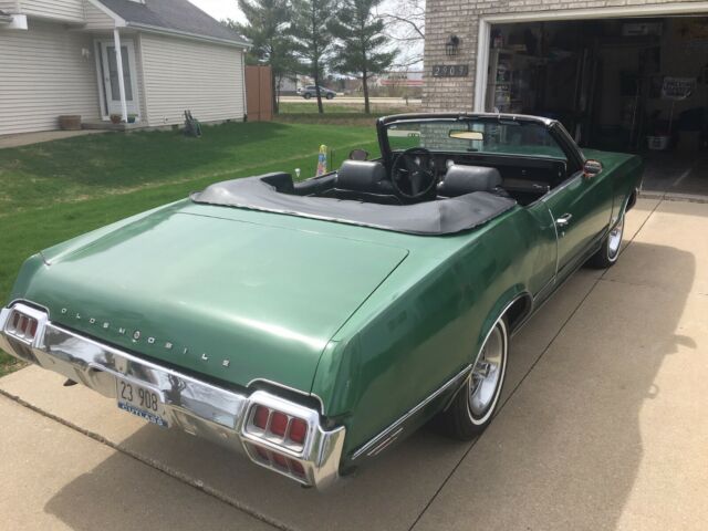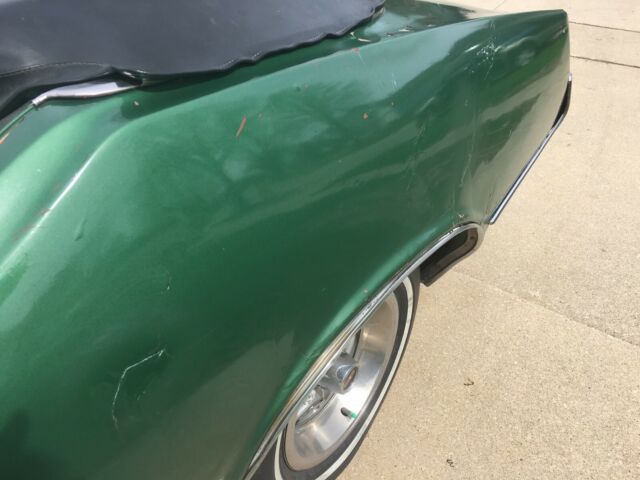 It's got power brakes, power steering, the ultra-rare FACTORY AIR option (not working, but compressor turns; has condenser) and in the dark she lights up like an ocean liner at night. Exhaust system is fine; motor runs like a top. As I said, mechanically she's a trooper, but the body on the car needs help. On the negative side, both quarters are more Bondo than metal. The doors have some rust along bottom (out of sight); the fenders are good, as is the hood. The green paint job is very poor (original color was Sunburst Yellow), and there are flaws in THAT. The trunk bottom is just a scabbed-in trunk bottom from another Olds; it needs complete replacing. The white convertible top was new 25 years ago; it was never hung quite right (some wrinkles, no tears) and is a bit dirty, but it DOES have a glass back window. Might be salvageable. The motor for the convertible top works, but there are some air bubbles in the system (which I will bleed out); that makes the top slow to go up and down. The tires are fine; just functional. The spare is not the same size (15" vs 14") as on the car, but will get you home. The interior needs to be replaced; it was new 25 years ago; the rear and driver's seats are shot. The front passenger seat is fine. In conclusion, she's not perfect, but she is a runner and turns heads everywhere she goes, even when not at her best. The pricing for these muscle cars just keeps going up and up. This is your chance to get your own NOW while you still can.