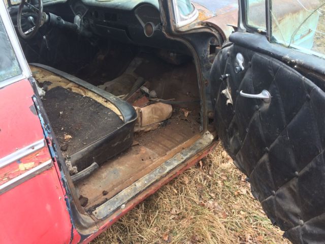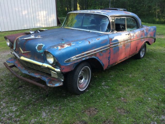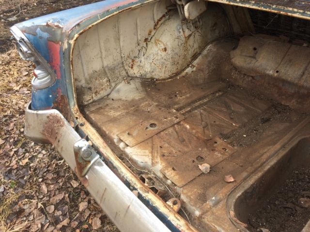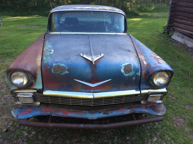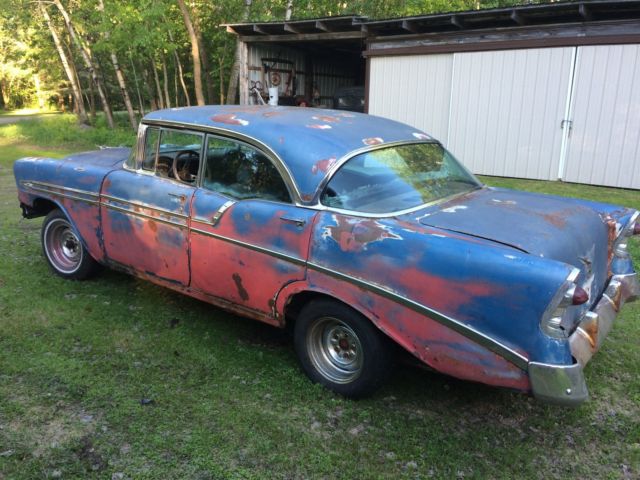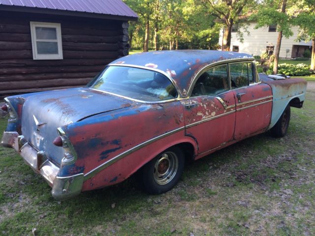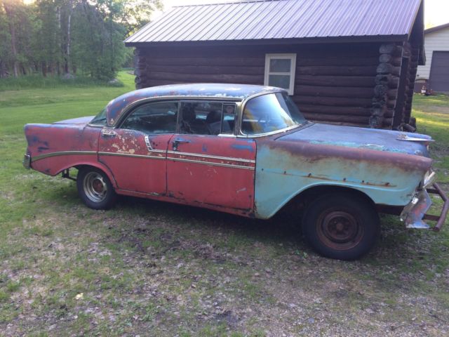 Up for sale is a decent 1956 Chevrolet Belair 4 Door Hardtop project car. This car originated from California and still has the original California one piece rear bumper. This car has potential but will require a full restoration. This car would also make a great donor vehicl. Front fenders are pretty nice with good solid hoods above the headlights. Car was originaly a V8 car. Car currently has no engine or transmission. Rear seat is original in poor condition and front seat is unknow make. Like most, the floors need work but the car is overall pretty solid. Car was hot rodded at some point and rear shock area in trunk will need some repair. Overall great restoration project or parts car. Car rolls great and will be an easy load on your trailer or arranged transport. Please view the listed photos and ask questions to make sure this is the vehicle for you. Please email me questions or feel free to contact me at 218-294-6497 to get more details. This vehicle is for sale within the United States. Any sales outside of the US will need to be approved by seller prior to entering a bid. Buyer is responsible for all transportation arrangements and costs. Vehicle does not have a title and will be sold with a bill of sale. This vehicle is being sold as is with no warranties, guarantees or returns. Please ask questions. Full payment to be received within 7 days of end of auction. Payment to be cashiers check or cash in person. Vehicle will not be released until full payment is received and cleared by my bank. Vehicle to be picked up within 21 days of end of auction. Any other arrangements to be cleared by the seller. I do reserve the right to end this auction at anytime due to vehicle being for sale in my local area. Thanks for looking and good luck