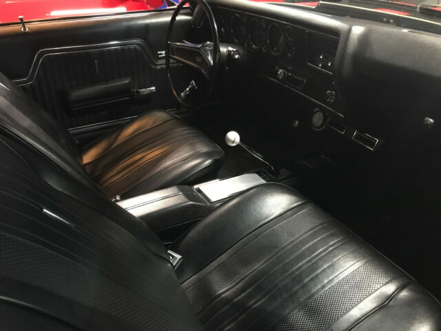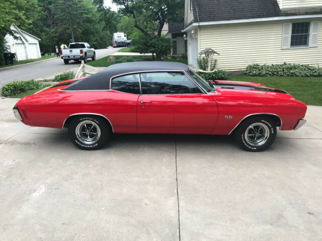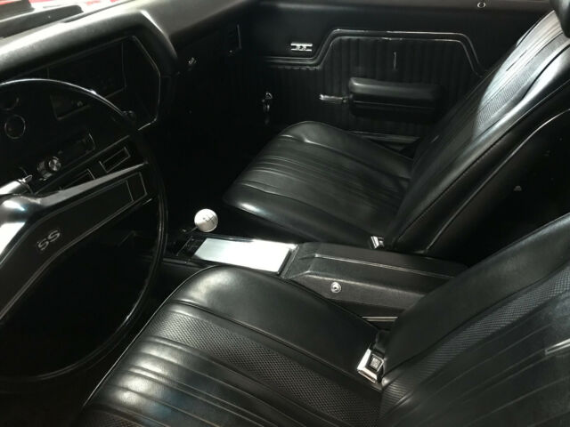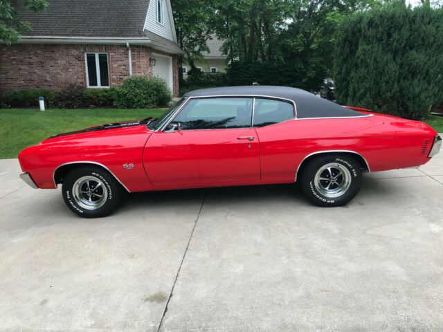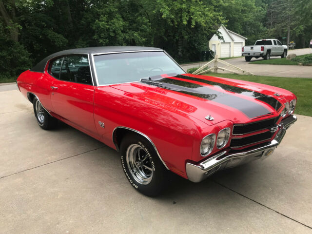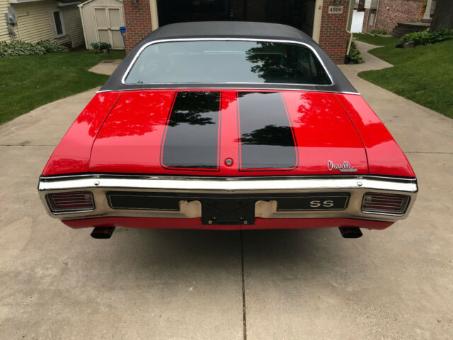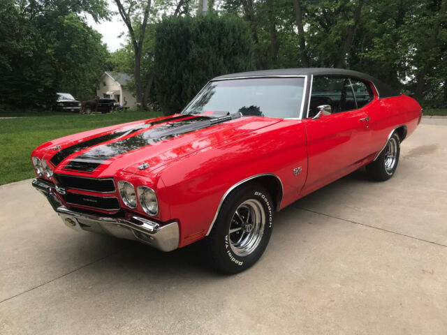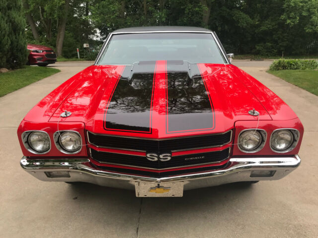 A true SS, this mild restomod retains its original numbers matching 396 engine. Equipped with a 3.55 rear gear ratio, power steering, power disc brakes, black vinyl top, black vinyl interior, tilt wheel, full tinted glass, bucket seats, floor console and full gauges. Upgrades include a Muncie M21 four speed transmission, Chevelle Sure Fit Vintage Air (car had factory air), JVC sound system and a dash carrier with chrome bezels. Also the cars original color was black cherry with an automatic transmission. Now Torch Red (beautiful base coat/clear coat) and the 4 speed as mentioned. Car was delivered by Dan Steakley Chevrolet in Temple, Texas (have NCRS Shipping Data Report) and maintains all its original rust free sheet metal and frame. Car was completely disassembled, all parts restored or replaced and built back up from the bare frame. Currently 7,200 miles on a full nut and bolt body off restoration. The original numbers matching engine (396-350) was completely rebuilt by Thomson Automotive Inc. (now Ligenfelter Performance Engineering). Have the file from Thomson which documents all parts, specifications and cost. Engine dynoed at 428 hp and 465 ft lb torque. The motor currently dressed (decals on air cleaner) as a 396-375 hp. The sound system is a JVC KDHDR50 stereo, dual AKG600 watt amplifiers, four Polk speakers, BSW 12" sub woofer with separate gain and volume controls. Stereo has USB port and media input and has incredible sound. The authenticity of a true SS is important. The following items were part of SS factory production on the 1970 models and are original to this car: Original numbers matching engine. 3969854 block casting number, T1126CTW stamp (396-350). 1 1/4 inch front stabilizer bar. Heavy duty steering shaft with extra bolt attaching coupler. 12 bolt rear differential. Rear sway bar. Boxed lower rear control arms with additional frame supports. L code on body plate. All but a few original SS Chevelles carry the L code.