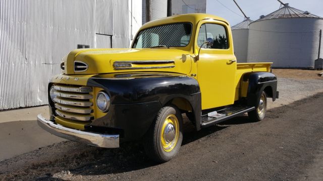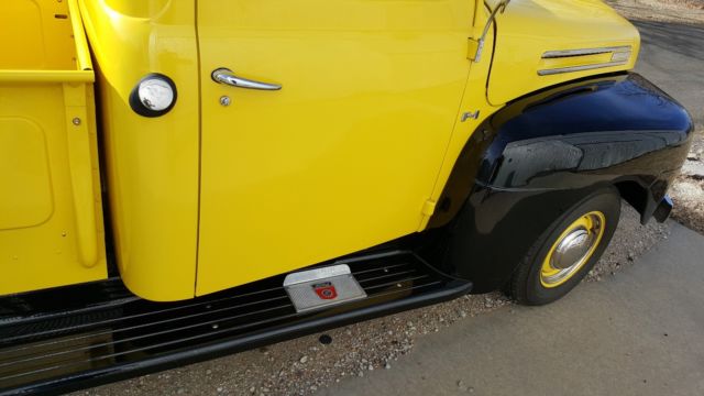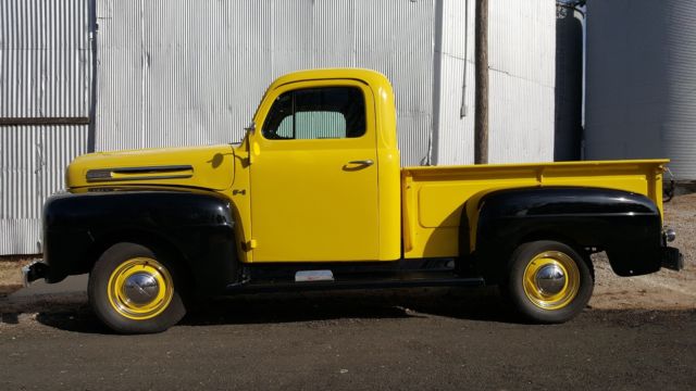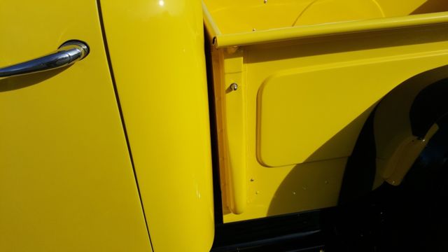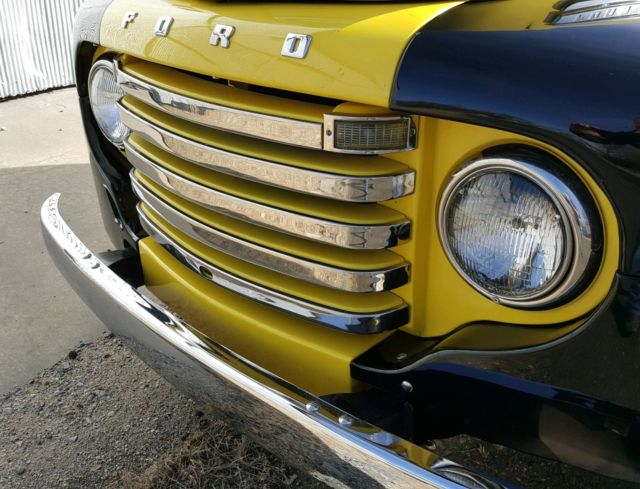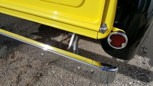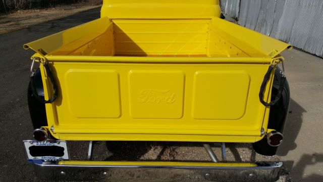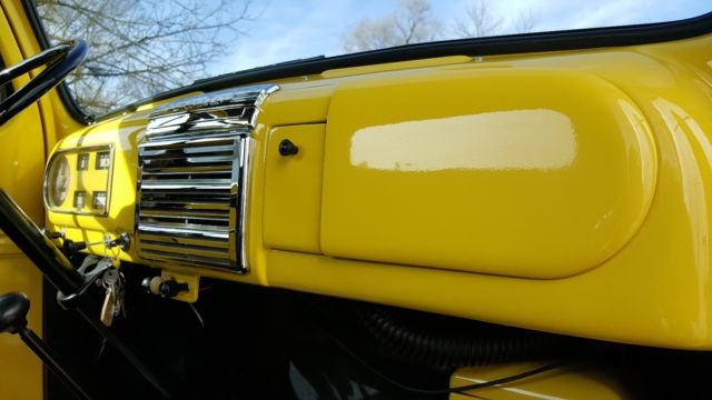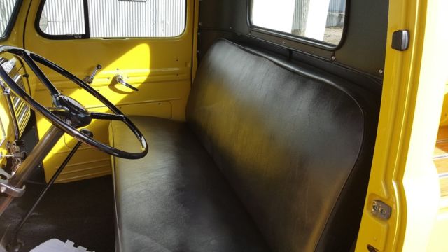 The V8 engine mated with the classic 3-speed transmission. Engine rebuild details: Valve jobR&R bearings, pump,changed rod, resealed panR&R Master cylinder, hose, bleed brakesResealed heads, head bolts, intakeReplaced water pumps All gears inspected, front cover resealedRepaired Distributor wiring Repaired Vacuum ControlReplaced Fuel PumpCleaned carburetorInstalled starter brushesCleaned & lubed starter driveWired lightsRegulator adjustedHeater Fan wiredParts Replaced:Rod Bearings, Main Bearings, Oil Pump, Pump Pick-up tube, Tube Pick-up screen, Replaced Oil, Head Gaskets, Intake Basket, 2 Water Pumps, Ignition Vacuum Control, Fuel Pump Push Rod, 2 Thermostats, Fuel Filter, Fuel Hose & miscellaneous fitting for fuel line, Starter Brushes, Rear Brake Hose, Brake Fluid, Battery Clamp, Antifreeze, Inline Fuse Holder for Fan Motor, Wiring Connectors, and Generator Brushes. Very nice stock black and yellow interior. The undercarriage is extremely clean. The truck has new tires, rims painted Chrome Yellow, brand new beauty rings and wheel covers. New chrome front and rear bumpers along with all new chrome accents. New windshield with rubber molding as well as side glass and back windows. New reupholstered seat on the factory bench. Restored and painted factory steering wheel. New headliner. New wiring harness & electrical components. New exhaust - super solid - clean and painted chassis black with many new suspension components. New brake lines, drum brakes. Heater works. No seat belts in any 1949. Wonderful attention to detail and show quality. This is a stock truck. CLEAN Kansas title. Beautiful wheel wells, straight body, very clean interior. Rides exactly like a 1949 F1 truck did when it rolled off the showroom floor! Unknown mileage. This auction can end at any moment. Check-out the F1's YouTube videos to see her run: https://www.youtube.com/watch?v=BoDiw4M7sVo https://www.youtube.com/watch?v=Jv78doTCk_g https://www.youtube.com/watch?v=EpeKfvtgYyE