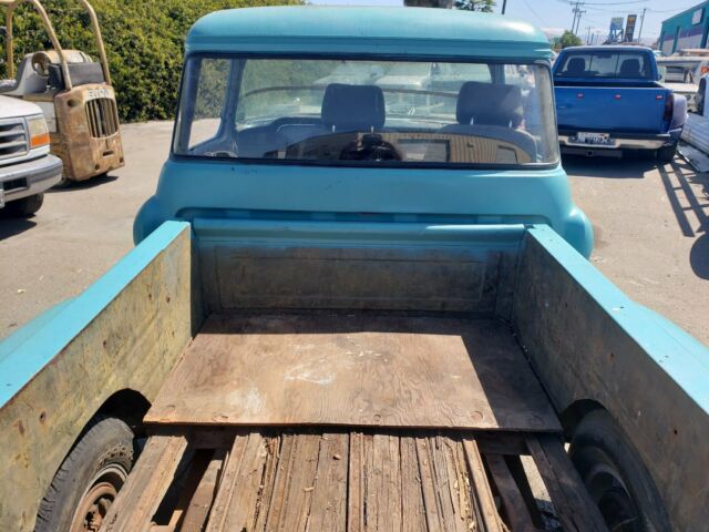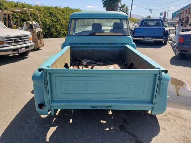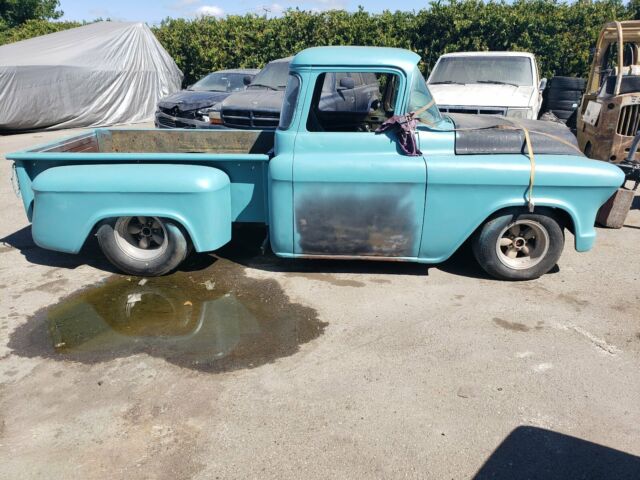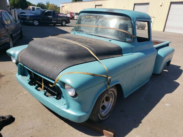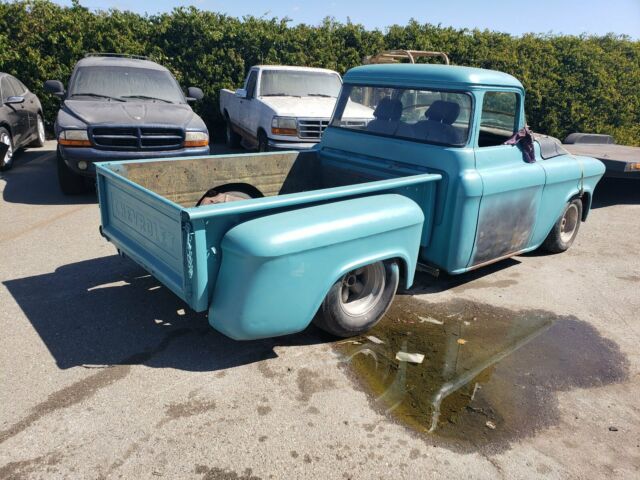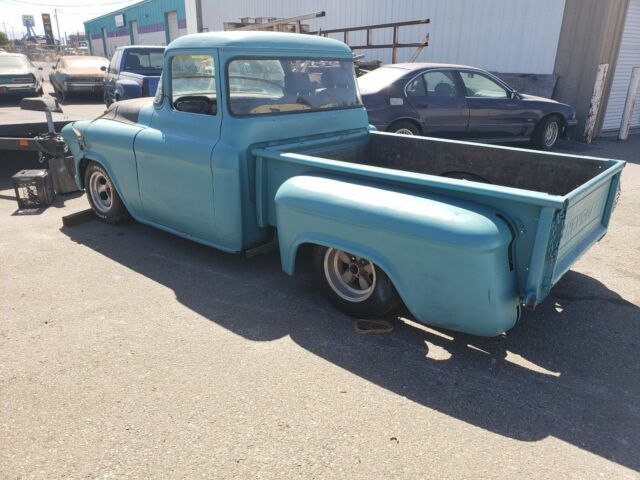 1956 Chevy Big window 1/2 Ton short bed stepside project... California truck Rust free lower bottom corners of the cab have a little rust couple holes in corners see photos. Body is solid floor firewall etc... Front windshield and rear glass in great shape no interior have custom Recaro seats rolling steering chassis with 10 bolt rear Camaro boxed in front clip with coil springs and disc brakes. missing door glass no motor or trans. I do have a big block 454 with forged internals and roller rockers that need to be rebuilt with a good turbo 400 available for extra cost body bed and tail gate in great shape. Lost Title sold with bill of sale and lost Title form. Truck has been out of DMV System. I have the other wheel matching set drivers rear fender started extending 2 inches and that is a front tire there the other rear wheel needs tire. Please call for more information (510)377-4297 Truck is also going to be posted locally...