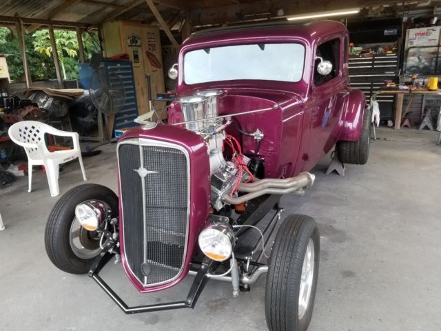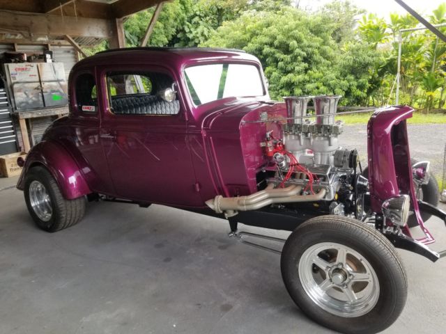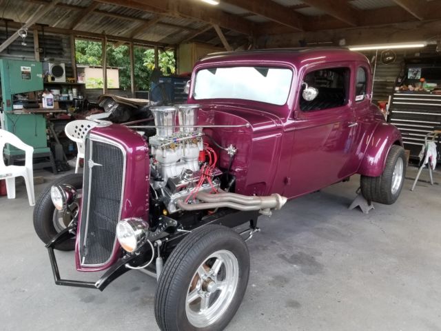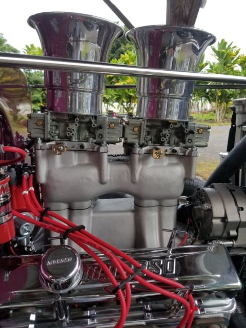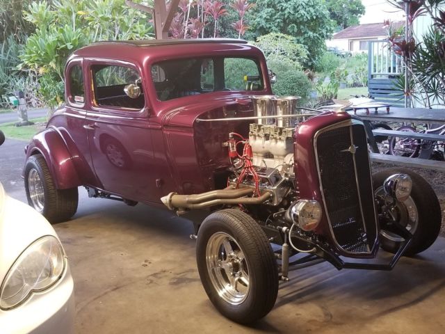 I have this 34 Chevy up for sale. This car was Built with lots of Love. I purchased this 34 at the Pomona Swap meet in Cali about a year ago and Rebuilt it in Hilo, Hawaii. I took the body off the Frame adding a new Ford 9 inch Rear End, new Posi with a set of 373 Gears. Its got a 2 Spd Power Glide Tranny. Beautiful chevy 327 Motor with everything roller. New Edelbrock Roller Heads, tunnel Ram, new 600 Hollys, 2800 stall converter, new Interior, new Floors! All covered in Dino mat. The wood in this car has been updated in Hawaiian hardwood called Koa and Mango. All Nuts and Bolts are new. I also installed a 34 Chrome Drop Axle with hairpins. Brand new Aluminum Radiator, Chrome Electric Fan, new Wiring Harness. Everything Works!! Turn Key!! Runs as Good as it Looks!!! I am offering Free Shipping to any California Port at my expense if car is sold! Please don't bid unless you have a 100% feed back!! Please don't hit the buy it now button unless you ask your Wife first!! This is a Extremely Beautiful Steel Body with fiberglass back fenders. She has Billet Specialties Rims with new Tires and 4 way Disc Brakes. I have shipped many cars from and to Hawaii, I live 2 miles from the shipping port in Hilo. I welcome All International Buyers. I require $1,000 Deposit into Pay Pal if you Win bid or buy it now. Final payment will be bank wired. She is a Head Turner!!! And She Sounds Crazy!!!! Good Luck!!!