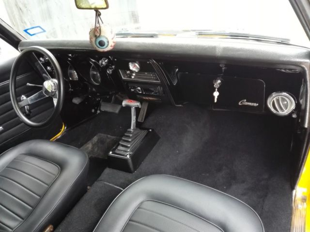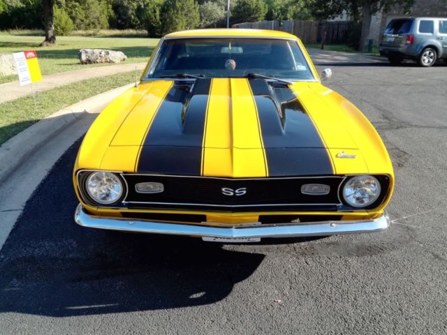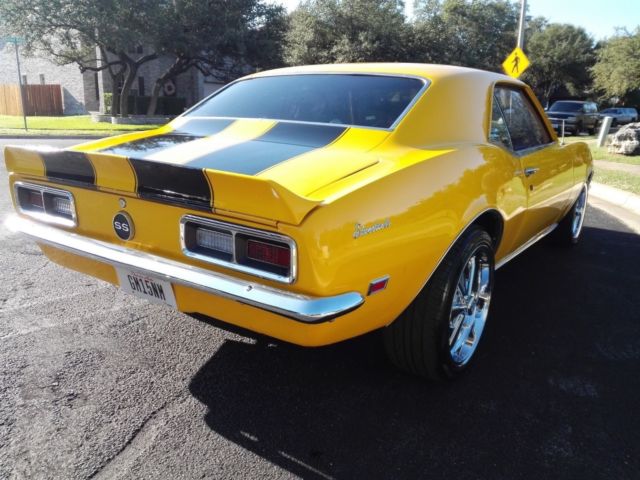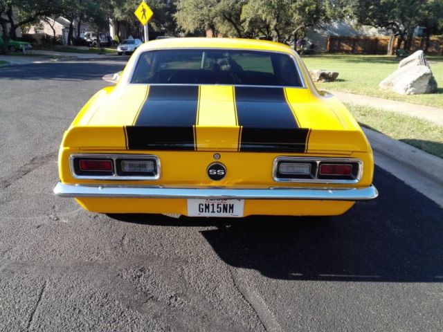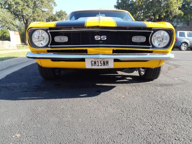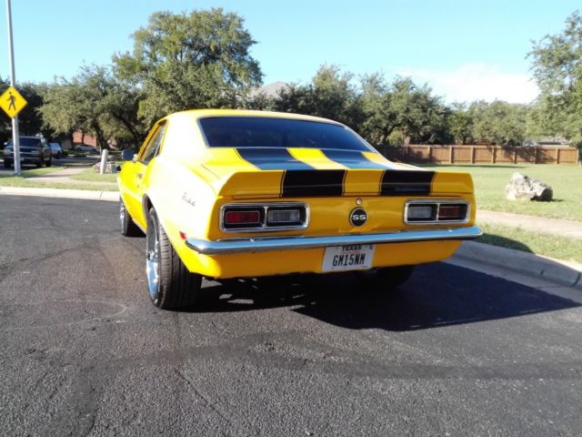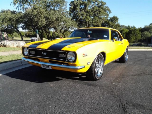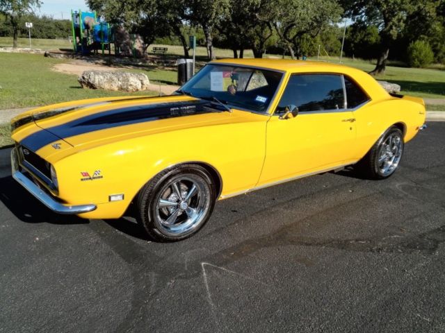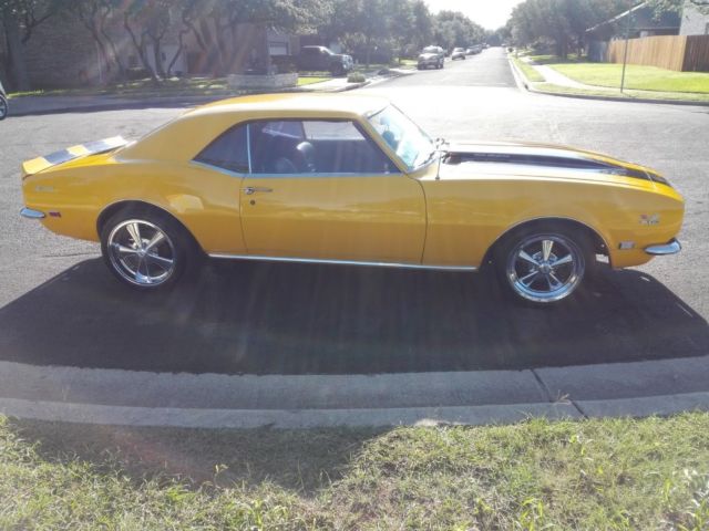 1968 Camaro for sale Big Block, Automatic This beautiful car was restored March 2018. The interior was the last thing done on October 2018. The car is now complete. This car has a Chevy Big Block engine with automatic transmission. The mileage after restoration is 123. List of parts Replaced/New : Make me an offer please call or text (512) 698-7570 Motor: -Chevy V8 Big Block Engine -Dome Pistons -Crank shaft -Rods and Main Barings -Competition Camshaft -High Volume Oil Pump w/ metal shaft and screen -Cylinder Piston Rings -Full Gasket Set -Double Roller Timing Chain 3 Piece -High Performance Intake Manifold -Hydraulic Lifter Set -Water Pump -Temperature Sending Unit -Header Set -Motor Mount Kit -Motor Mount -Oil Pressure Sender Unit -And many more Electrical: -HEI Distributor -Headlight Switch -Dimmer Switch -Turn Signal Light Switch -All Dash Light Bulbs -Steering Wheel -Ignition Set w/ Key -Horn Relay -Starter -Alternator Paint: -Fresh Paint Job -Yellow Corvette Base + Clear -Black Racing Stripes Transmission: -Rebuilt Automatic Transmission -Torque Converter -Tranny Bracket -Tranny Mount Differential: -Rear End Posi-Traction -Drive Shaft w/ U-Joint Chrome: -Front Bumper -Rear Bumper -All Side Marker Lights -Rear Tail Light Assembly w/ All Complete Lens -4 Wheel Well Moldings -Chrome Air Cleaner -Gas Cap Interior: -Complete Interior Finish -Carpet -2 Bucket Seats -Rear Bench Seat -Headliner -Door Panels -Rear Side Panels -Door Seals -Glove Box Weather Seals: -Front Windshield Seal -2 Door Seals -Trunk Seal -Door Post Bent Seals Front End: -2 Upper Ball-Joints -2 Lower Ball-Joints -2 Inner Tie Rod Ends -2 Outer Tie Rod Ends -2 Sleeves -Idler Arm -Stabilizer Busing Kit -Front Shocks -Rear Air Shocks Ignition: -Ignition Distributor -Ignition Wires -8 A/C Delco Spark Plugs -Cap and Rotor Tires/Wheels: -Front Chromed Wheels -Rear Tires 215-45 R17 -Rear Chrome Wheels -Front Tires 245-40-ZR15 Brakes: -Master Cylinder -2 Front Brake Drums -2 Front Brake Shoes -2 Front Wheel Cylinders -2 Front Brake Hoses -2 Rear Brake Drums -2 Rear Wheel Cylinders -Rear Brake Hose -Front and Read Brake Hardware Fuel: -Holly 750 Carburetor -Fuel Pump -Fuel Pump Shaft -Fuel Filter -Gas Tank -Fuel Sending Unit For more Info call or text Robert (512) 698-7570 Too Many More Parts to List. More Pictures Available Upon Request. Please note that this car has NO A/C, NO Power Steering, and NO Power Breaks. Also, The Wiper Motor Does Not Work Due to Size of Engine. Requires Electric Wiper Motor.