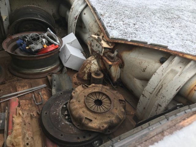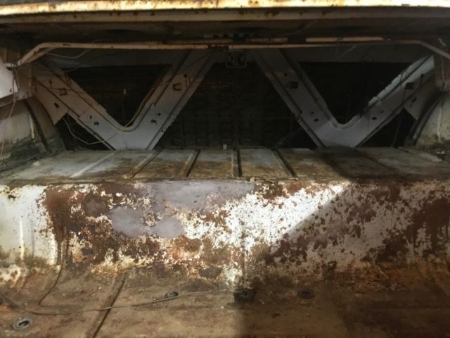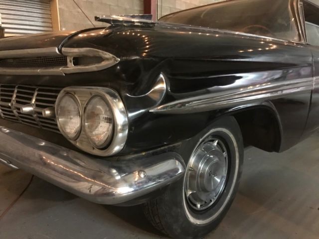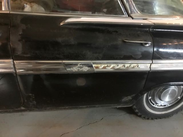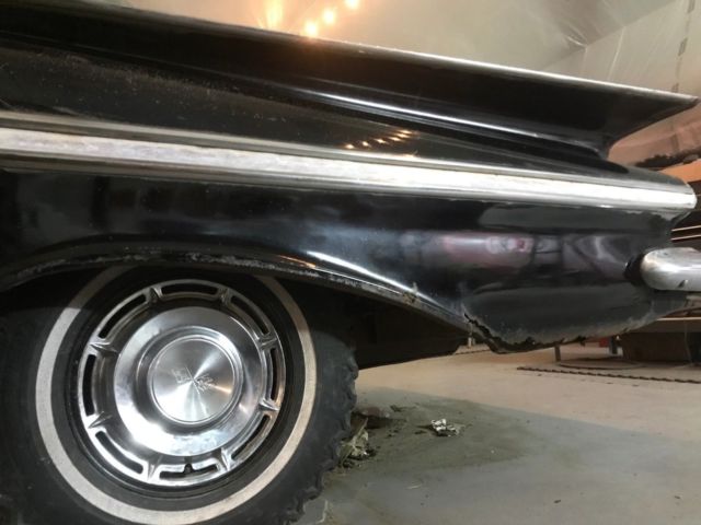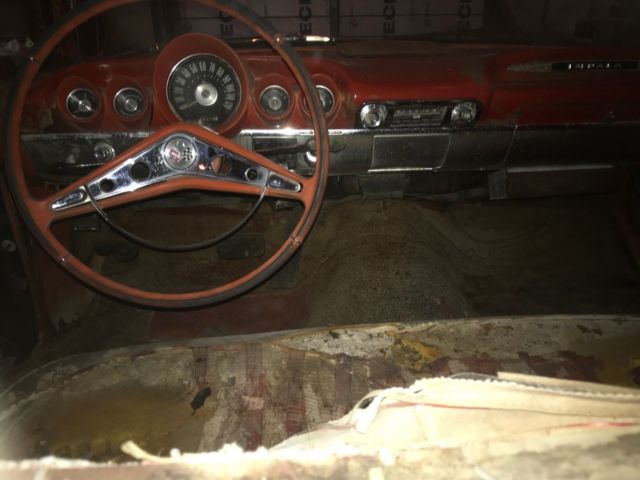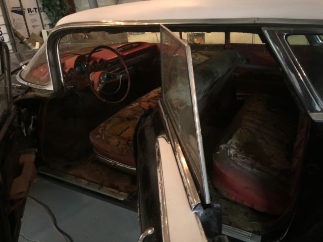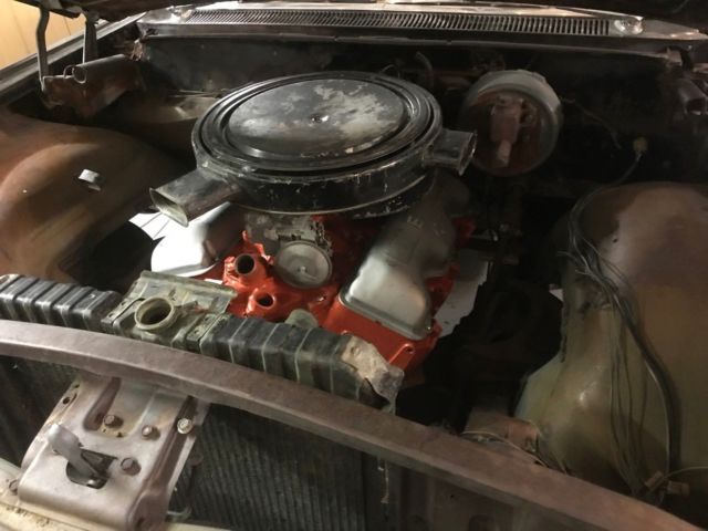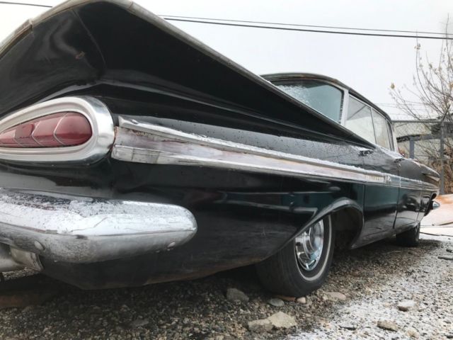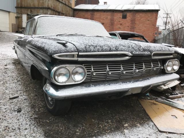 The body shows to be solid as seen by the pictures showing under the car and spare tire wheel well, although with closer inspection, rust was found on the bottom rear of drivers quarter panel, drivers side rear passengers foot area and small areas in the trunk floor. Dents with the two largest on left fron fender and right rear quarter. The engine was taken out to be rebuit many years ago. Look at the engine pictures to see the real 3x2 valve covers, as the rear spark plug wire bracket is much shorter (to have distance from the air cleaner) than the standard tall wire holders. Both, engine will need over sized pistions, transmission will need a complete rebuild, front and back carburators do not move and all the lincage is on the carburators. Engine and trany need the spacer plate for solid connection, trany needs flex plate. The cars still has the 4 bigblock wheels. Engine casting # 3755011 date K1758 (November), Head casting # 3759256 GM4 (1959 only) , Intake # 3749948 date N2158. This is an old car and is being sold "as is".