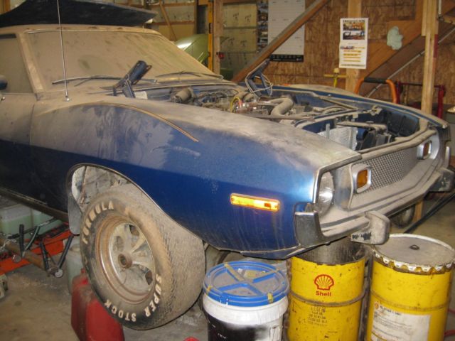 1974 AMC Javelin. I have owned the car since 1976. Body is almost rust free & very restorable. been stored inside since 1990. Engine runs great although will need pan & valve cover gaskets due to age. Stock engine was 304 2bbl. I removed the stock engine & replaced with rebuilt 1967 343. Engine has 1969 heads. Aluminum Edelbrock Torquer intake, Crane cam, TCI 2400 rpm stall converter, 513 rear end gears,250hp. Marvin Miller Nitrous oxide with a 10lb & a 20lb tank. Edelbrock aluminum valve covers, 750 Holley double pumper. I have the stock hood & a AMX cowl induction hood, AMX rear spoiler. Has stock Torqueflite transmission with deep pan. Keystone Classic wheels have some rust on them, not sure how well they will clean up. Tires hold air but are not drivable. Trans slips & will need to be rebuilt. I always thought I would find time to bring her back in shape but at this point I realize its not gonna happen & I am sure some one will give the car the respect it deserves. Not many of these left. Contact me with any questions. Need to find her a good home. Will assist with shipping or can deliver for an agreed price. May consider partial trade for ?