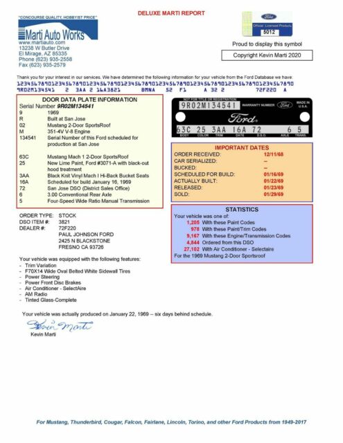 1969 Ford Mach 1 FastbackTop Line InformationYear:1969VIN:9R02M134541Make:FordStock:134541Model/Trim:Mach 1 FastbackCondition:Pre-OwnedBody:OtherExterior:BlueInterior:Blue Mileage:97,596Drivetrain:Rear Wheel DriveAdditional Photos* * * Click Photos to Enlarge * * ** * * Click Photos to Enlarge * * *DescriptionPLEASE NOTE THIS IS A CLOKE MACH1 AS IN CLONE/FAKE.1969 Ford Mustang Mach 1M code 351 4V car, 4 spd, PS, PB, A/CBlue/Blue interiorPLEASE NOTE THIS IS A CLOKE MACH1 AS IN CLONE/FAKE.Super Solid dry Central Texas car, factory big block shock towers yes some of the M code cars came from the factory with big block shock towers. Great color combo, great options excellent basis for a restoration or Rest-O-Mod, no drive train. What you see in all the pictures is what you get. NO ENGINE or TRANSMISSION, lots of misc. parts in the trunk. Titled as a 1970, we believe this is a 1969 with 1970 trim, we have attached the Marti Report and there is inconsistencies, the car has been inspected by law enforcement in Texas and was issued a surety bond stating that this vin goes on this car therefore receiving a clear Texas title with bonded title in the Remarks section.This car is best suited for a Resto-Mod build it is very solid and is priced below what you would pay for an aftermarket body with no title. $12,800.00 FIRM!!! World wide shipping is available.$12,800.00Stock# 134541At our dealership we work very hard to accurately describe our vehicles through text descriptions and elaborate photos. When you purchase a pre-owned vehicle it is not a new vehicle. Any used vehicle can have normal wear and blemishes. Before placing a bid please read the descriptions thoroughly and view all pictures. Included Standard Equipment Hours of OperationMon: Tue: Wed: Thu: Fri: Sat: Sun: 9a - 6p9a - 6p9a - 6p9a - 6p9a - 6p9a - 3pClosed Vehicle ValuesVehicle History Warranty TermsPayment Types:Cash, Wire Transfer, Certified Funds and Institutional FinancingFees:Out of State BuyersOut of state buyers are not charged tax, title, or license. The customer is responsible for registering the vehicle in their home state.Taxes and FeesIn state buyers will be charged state and local taxes, title, registration, and documentary fees. Our documentation fee is $150. All sales transactions must be completed within 5 days of auction close.DepositWe require a $500 deposit within 3 days of winning the auction. Please call the dealership to make arrangements for payment.Terms:Auction PoliciesCustomers with zero or negative feedback on eBay Motors please contact us prior to bidding. Otherwise, we reserve the right to cancel your bid. Understand this is only to protect the integrity of the auction. Winning bidder must contact the dealership within 24 hours of the auction close and the purchase transaction completed within 5 calendar days. We reserve the right to re-list or sell the vehicle in the event of a non-paying bidder.Buyer PickupA representative from our dealership can be available for pickup at area airports when necessary. Buyers must schedule pickup prior to making travel arrangements. Collins Brothers Jeep3101 W. FM 544Wylie, TX 75098 ©2003-2020AutoRevo- All Rights ReservedDealer Websites and eBay Templates Powered byAutoRevo