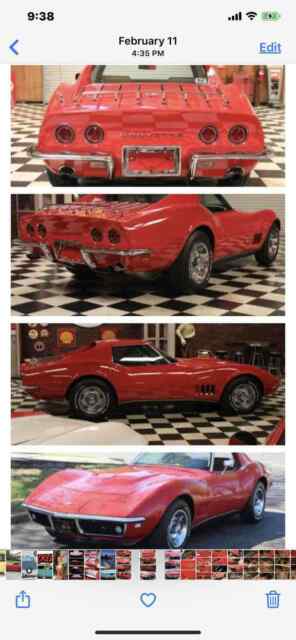 @import url(https://fonts.googleapis.com/css?family=Roboto); About this vehicle This 1968 Chevrolet Corvette is a restored vehicle. The owner has had it for 1 year. The vehicle runs great and is mainly used for car shows. Seller's Notes Up for sale is a 1968 Corvette Coupe Big Block 427/390 with automatic transmission. Nut and bolt frame off restoration. Same family owned until 2010. All matching numbers It is Rally Red with light Saddle vinyl interior. It has a big block 427/390 with automatic transmission. Originally a California car and one family owned that was stored from 1978 to 2010. In 2010 it was pulled from storage and underwent a no expense spare nut and bolt frame off restoration. During the tear down of the car the build sheet was found on the gas tank showing a final build date of June 17th, 1968. Car comes with many before and after photos as well as owners manuals. Only 1 of 15 with these options and colors. Matching numbers, L36 427 C.I.D 390 hp, turbo 400 automatic transmission, heavy duty posi-trac 3:08 Exterior Excellent Exterior Condition! Interior Interior Is In Mint Condition! Engine Engine is in Excellent Condition and Clean! Deposits are nonrefundable. Created on the eBay Motors app