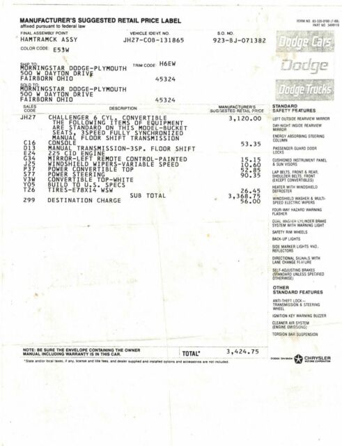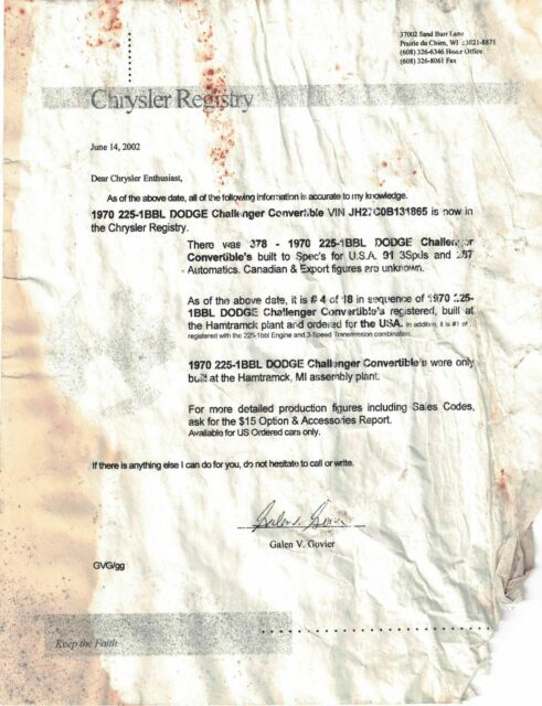 1970 Dodge Challenger Top Line InformationYear:1970VIN:JH27C0B131865Make:DodgeStock:131865Model/Trim:Challenger Condition:Pre-OwnedBody:ConvertibleExterior:RedEngine:225 CID 6 cylInterior:Red VinylTransmission:3 speed manualMileage:99,999Drivetrain:Rear Wheel DriveAdditional Photos* * * Click Photos to Enlarge * * ** * * Click Photos to Enlarge * * *Description1970 Dodge Challenger Convertible1of 91 3 speed manual 225 CID 6 cylinder convertibles built. Please view Chrysler registry letter from 2002 and copy of window sticker attached to the listing.This car has an amateur restoration performed approximately 20 years ago along with amateur rust repair and it still has typical E-body rust issues clearly pictured in our detailed photos.Stored for past 15 years we have made no attempt to get the car running and driving.A great candidate for Resto-mod or Hemi clone build. Manual transmission E-body convertible project cars are very tough to find.Aggressively priced for quick sale.First $29,800.00 gets the car.Stock# 131865At our dealership we work very hard to accurately describe our vehicles through text descriptions and elaborate photos. When you purchase a pre-owned vehicle it is not a new vehicle. Any used vehicle can have normal wear and blemishes. Before placing a bid please read the descriptions thoroughly and view all pictures. Included Standard Equipment Hours of OperationMon: Tue: Wed: Thu: Fri: Sat: Sun: 9a - 6p9a - 6p9a - 6p9a - 6p9a - 6p9a - 3pClosed Vehicle Values Warranty TermsPayment Types:Cash, Wire Transfer, Certified Funds and Institutional FinancingFees:Out of State BuyersOut of state buyers are not charged tax, title, or license. The customer is responsible for registering the vehicle in their home state.Taxes and FeesIn state buyers will be charged state and local taxes, title, registration, and documentary fees. Our documentation fee is $150. All sales transactions must be completed within 5 days of auction close.DepositWe require a $500 deposit within 3 days of winning the auction. Please call the dealership to make arrangements for payment.Terms:Auction PoliciesCustomers with zero or negative feedback on eBay Motors please contact us prior to bidding. Otherwise, we reserve the right to cancel your bid. Understand this is only to protect the integrity of the auction. Winning bidder must contact the dealership within 24 hours of the auction close and the purchase transaction completed within 5 calendar days. We reserve the right to re-list or sell the vehicle in the event of a non-paying bidder.Buyer PickupA representative from our dealership can be available for pickup at area airports when necessary. Buyers must schedule pickup prior to making travel arrangements. Collins Brothers Jeep3101 W. FM 544Wylie, TX 75098 ©2003-2020AutoRevo- All Rights ReservedDealer Websites and eBay Templates Powered byAutoRevo