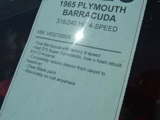 508-273-7289 1234567891011121314151617181920of20 Show More See Full Size Photos 1965 Plymouth Barracuda Classic coupe 38083 Miles Black 318 4 Speed Stock #: 12345 Exterior Color: Black Interior Color: Red Transmission: 4 Speed Drivetrain: 2WD Engine: 318 Title Condition: Clear Vehicle Description Florida Car absolutely rust free many new parts including gasoline tank mouldings and 318 Re-Built MotorNew Interior and Carprets. Factory 4 Speed Just a fun car in excellent contionOdometer reads 38283 miles True Mileage is unknown Visit Buzzards Way Garage online at to see more pictures of this vehicle or call us at 508-273-7289 today to schedule your test drive. Contact us now at 508-273-7289 for more details! Contact us for more details: 508-273-7289Call Dealer Photos Vehicle Warranty Most new vehicles come with a factory warranty and some used vehicles have a remaining factory warranty. Please contact us for the warranty details specific to this vehicle. Terms and Conditions Finance, Warranty, Shipping question? - Call the dealer at 508-273-7289 Payment Options We accept the following payment methods: - Cashier's Check/money order Vehicle Pickup & Shipping All shipping charges are buyer's responsibility. General Terms Notice to Bidders: The vehicles we list for sale at eBay are also for sale at our retail location. Please contact us to confirm vehicle availability. We reserve the right to end an auction early. Deposit: We require a non-refundable $500 deposit within 48 hours of winning the auction. Please call to make arrangements for payment. We accept the following forms of payment: Cash in person, certified funds, institutional financing. All sales transactions must be completed within 7 calendar days of auction close. Prices are subject to change without notice. Although every effort is made to present accurate and reliable vehicle information, use of this information is voluntary, and should only be deemed reliable after an independent review of its accuracy, completeness, and timeliness. It is the sole responsibility of the customer to verify the existence of options, accessories and the vehicle condition before time of sale. Any and all differences must be addressed prior to time of sale. No expressed or implied warranties, including the availability or condition of the equipment listed is made. EPA mileage estimates are for comparison purposes only. Actual mileage may vary depending on driving conditions, driving habits, and vehicle maintenance. Fees and Taxes State or local taxes, title, license fee, processing fees, registration fee, dealer documentary fee, finance charges, emission testing fees, and compliance fees are additional to the advertised price. NEED ASSISTANCE WITH SHIPPING OR TRANSPORTATION WE CAN HELP YOU WITH THAT. WE HAVE ACCESS TO CARRIERS ALL ACROSS THE COUNTRY. JUST GIVE US A CALL 508-930-8903