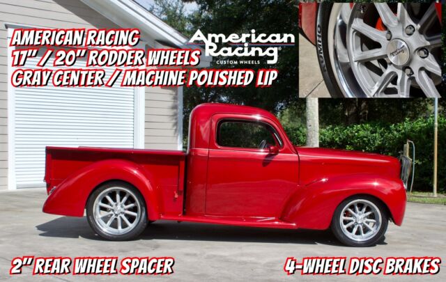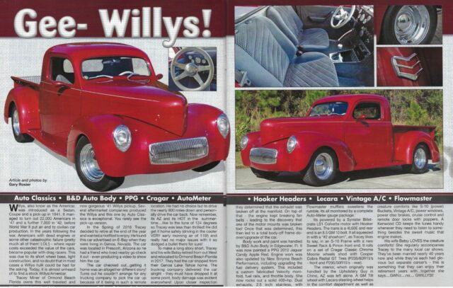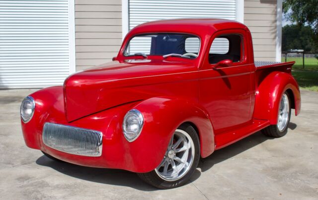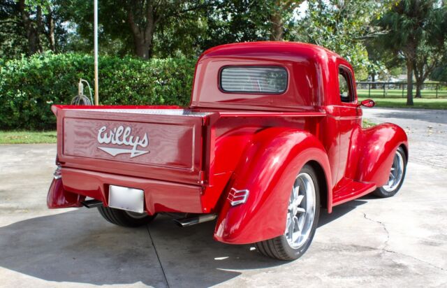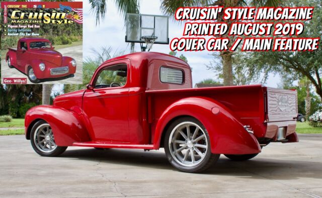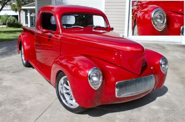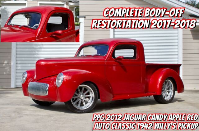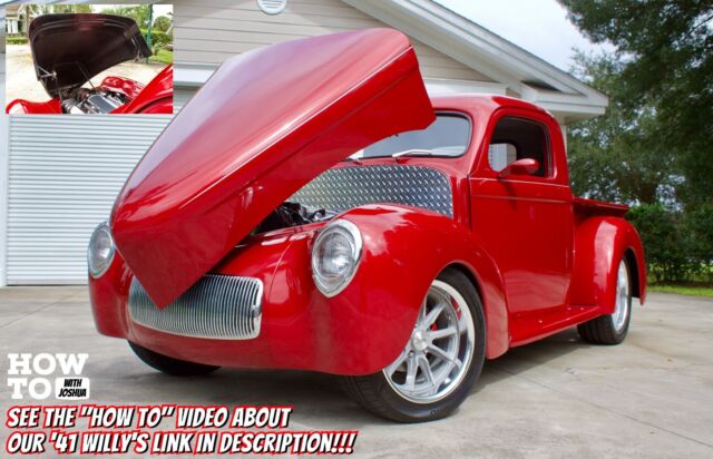 1941 WILLYâS 400HP LS1 PICKUP TRUCK / AUTO CLASSIC â41 WILLYâS BODY400HP 5.7L CORVETTE LS1 CRATE / 4L60E AUTOMATIC TRANSMISSION CUSTOM LEATHER INTERIOR / VINTAGE AIR A/C / CRUISE CONTROLCOMPLETE BODY-OFF RESTORATION & FRAME MODIFICATION 2017-2018PPG 2012 JAGUAR CANDY APPLE RED EXTERIOR / LIGHT GRAY LEATHER INTERIOR NEW 17â & 20â AMERICAN RACING RODDER WHEELS / NEW KUMHO ECSTA TIRES VINTAGE AIR A/C / DISC BRAKES / POWER STEERING / CRUISE CONTROL / GM 1-BOLT REARTO SEE FULL VIDEO CLICK HERE:https://www.youtube.com/watch?v=y3GiOIiGduITO SEE âHOW TOâ VIDEO CLICK HERE:https://www.youtube.com/watch?v=snA-w4H4iC0&t=177s PLEASE GIVE ME A CALL OR TEXT ANYTIME //STEVE PHELPS @ 407-435-9745This â41 Willyâs was featured in the printed âCruisinâ Style Magazineâ as the cover car for August 2019 & a full 3-Page Main Feature for that issue. This was a full body-off restoration & frame modification from 2017 to 2018. This â41 Willyâs is a HIGH-Quality Show Truck & The Ultimate Daily Driver. With 11K miles since built, you will not see another Willyâs like this!!!EXTERIOR:Auto Classic 1941 Willyâs Pickup BodyPPG 2012 Jaguar Candy Apple Red Exterior [Painted 2018 By: B&D Customs INC. (Edgewater, FL)]Custom Silver Hand-Painted Silver âWillyâsâ Tailgate [Mikey Ayers 2020]Chrome Grille & TrimShaved Suicide Doors w/ Remote Powered Door PoppersCustom Polished Diamond Plate & Oak Wood BedCustom Polished Diamond Plate ToolboxAmerican Racing 17â & 20â Rodder Gray Centers w/ Polished Lip WheelsBlack 2â Rear Wheel SpacerKumho Ecsta PA51 Performance Tires Front: 245/45ZR17 // Rear: 275/40ZR20INTERIOR:Custom Light Gray Leather & Diamond Stitched Interior Electric Powered Door WindowsLight Gray Leather Wrapped & Polished Lecarra Steering WheelBlack GM Tilt Steering Column Cruise ControlGloss Black DashAuto Meter Old-Tyme II Gauge KitChrome âWillyâsâ Dash Badge Vintage Air A/C Controls Kenwood Digital HD Radio w/ CD Player Piston Shifter Knob / Automatic Floor ShifterChrome Lokar Performance Emergency Brake [In Between Seats]Black Carpeted Interior Flooring Custom Light Gray Leather & Diamond Stitched S10 Powered Bucket Seats Custom Gray Suede Headliner PERFORMANCE:400HP // GM 5.7L Corvette LS1 Crate Motor [Built By: NSB Performance (New Smyrna Beach,FL)]K&N Short-Ram Air Intake w/ Red Throttle SpacerAluminum TSP Velocity Intake Manifold w/ Polished Fuel RailsCBM Motorsports Polished âCorvetteâ Fuel Pack Covers Polished Hooker LS1 Headers GM 4L60E Automatic Transmission w/ Overdrive Sweet MFG Front Rack & Pinion Front End 2.5â Stainless Steel Exhaust & Flowmaster Mufflers Chevrolet S10 Subframe Powered Disc Brakes Chevrolet 10-Bolt Rear EndPLEASE GIVE ME A CALL OR TEXT ANYTIME //STEVE PHELPS @ 407-435-9745