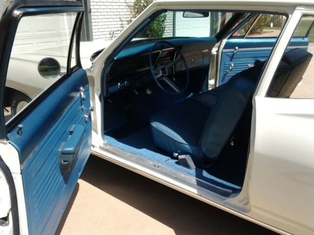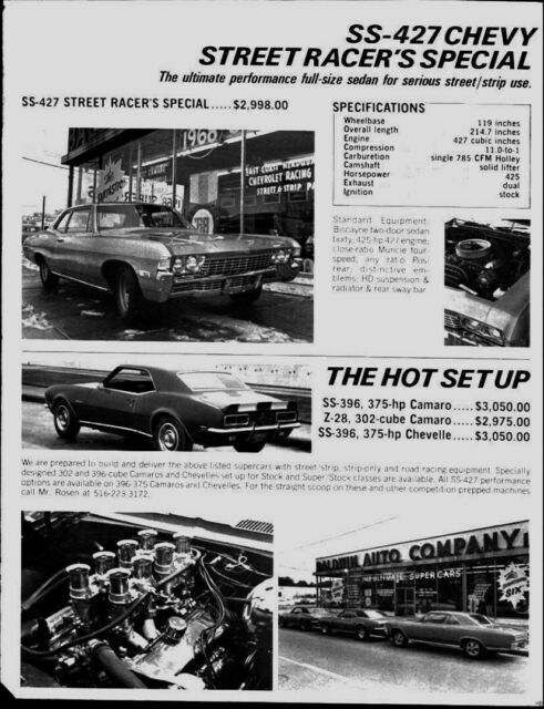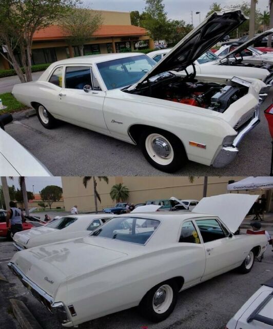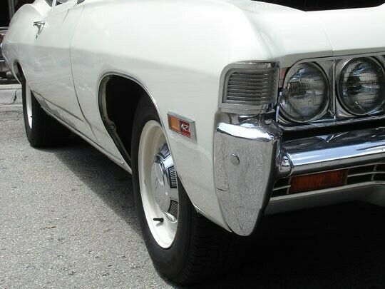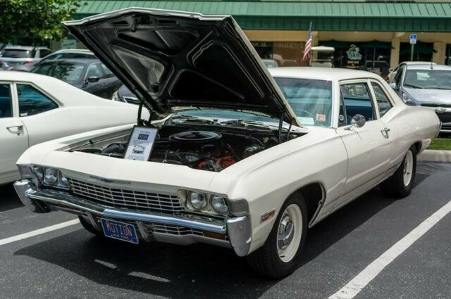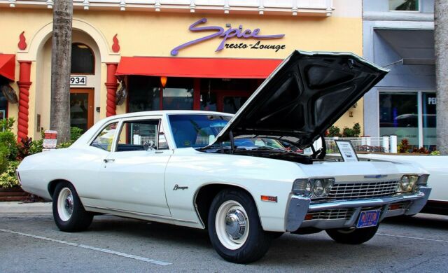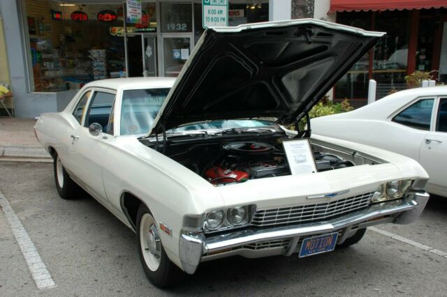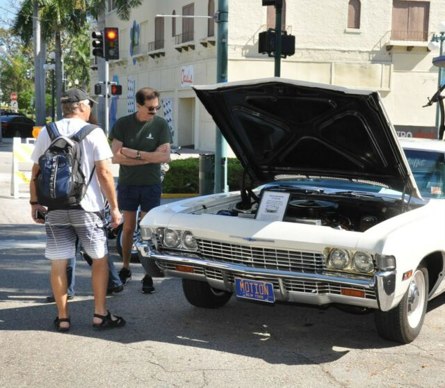 Tribute to the 427 Biscayne's that came from Motion Performance/Baldwin Chevrolet on Long Island in 1968 L34 396, alloy midrise intake, Holley 750cfm model 3310, 4 row aluminum radiator, shroud, flex fan. HEI distributor, ceramic coated 2 inch primary, 3 1/2-inch collector, long tube Hooker Competition headers, full dual 2.5-inch exhaust with balance pipe and Flowmaster 40 series mufflers. 3/8 inch fuel line tank to carburetor. Turbo 400 Hydro transmission, shift kit, Art Carr/Winters shifter, (original stock column shift with linkage and 3 speed indicator included). New drive shaft; balanced with new u-joints. Rebuilt 12 bolt rear with Richmond 3.73 gear and positraction, heavy duty axles, 11" drum brakes and Corvette 2-piston front disc front brakes, power steering. Body has been refinished with PPG single stage urethane in Ermine White; beautiful. Interior restored really well using correct '68 Biscayne material, looks great. This is a radio delete car. Period correct AutoMeter 8K American made tachometer. Triple gauge panel. All glass is original except for the windshield, which is a new PPG blue shade band. Bright work looks great; re-chromed rear bumper. All engine bay compartment sheet metal has been powder coated satin black. Has clear Florida title, private seller.Clean, clean clean., no rips tears. Car is an absolute dream to drive, plenty of torque, runs at thermostat temperature and stops well. Lost of attention. 1968 Chevrolet Biscayne big block supercar! Don't miss it at this price. No third party vendors. Thank you for your interest. $19,665. Dial: 9 five 4 6 five 5 three 9 five 3 Only for the serious (I have the funds now) buyers. .