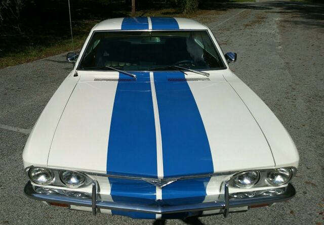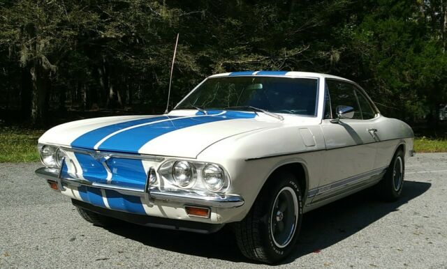 It's a Yenko Stinger tribute car. I bought it in CA. in 2008. It's painted ermine white with acapulco blue racing stripes, paint still looks very good. The Turbo rocker panel stripe is a decal. It's powered by a 220 HP turbocharged engine, the engine number is T0107RL. It has a modified 2 barrel Weber 40 side draft carb, with water injection, the boost juice is included. It has a rebuilt for performance turbo from Grant Young at Wolf Enterprise. A spare turbo comes with it. New clutch and bearings. Corsa quick shift 4 on the floor shifter. with black 8 ball size shift knob. Recently lubed and adjusted. New dual bearing distributor with points. All the mechanical, electrical, brake, engine, suspension, carb and fine tuning done by "Fast" Eddie Meadows, expert Corvair mechanic and racer. He has a real Stinger that he still races. His car inspired me to do mine. He installed new brake lines and refreshed brakes. Removed, examined and cleaned the heads, valves, valve springs and installed new head gaskets and exhaust gaskets. Installed new gas shocks, coil springs and some bushings. It has convertible coils in front to lower it. New electric fuel pump. Finned aluminum oil pan and valve covers. Chrome Edelbrock oil filler cap and new turbo badge on rear deck. Aluminum engine side panels for better cooling and looks. It comes with vintage American Racing Daisy Mags and Firestone Indy 500 raised white letter tires, they don't make the white letter ones anymore. 215x60x14 front, 235x70x14 rear. Spare Indy 500 tires on rims come with it. Solid car, only surface rust, never wrecked or driven on salted roads. Floors, wheel wells, doors jams are all clean, solid and rust free.The interior is all original, the front seats are hard to find factory bucket seats with built-in headrests. Padded dash. Original carpet in good shape. It needs a headliner, a new one comes with the car, it needs to be installed. The interior is in good shape, no tears or rips, other than headliner. I installed digital oil pressure, oil temp and amp gauges in dash. Clock works! New window fuzzies and rubber door seals. New rubber seals on engine compartment and trunk. It has an adjustable length steering column, 14" racing steering wheel with new horn button. Only 66,000 original miles .Remember, you can't take your money with you but, you can buy this car and make some good memories to take with you. Driving this car is lots of fun. There are not many like it available. Prices are going up, parts are easily available and inexpensive. There is a National Corvair Club, CORSA and many local clubs around the country to meet with other owners, check out their cars and party.It is for sale locally and could be pulled at anytime. Please, don't bid if you can't afford it.