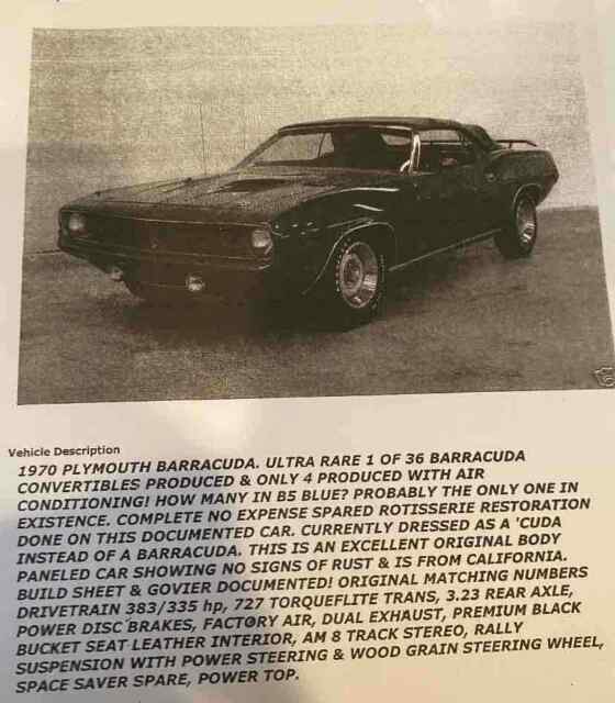@import url(https://fonts.googleapis.com/css?family=Roboto);About this vehicleThis 1970 Plymouth Cuda is a restored vehicle with updates to the exterior, interior and drivetrain. The owner has had it for 5+ years. The vehicle runs great and is mainly used for car shows.Seller's NotesIf you have any questions please call 805-552-4048ExteriorBorn as a 1970 Plymouth 383 Cuda Now it has a 426 Hemi 572 CI Engine. Slap shift automatic with overdrive. Beautiful B Blue factory color with black interior. 1 of 36 automatic factory Cudas. Owned by a friend of mine that had an exclusive multi million dollar car collection. $160,000 in receipts. I purchased the car from him in the late 90âs. He had unlimited funds and made this dream car into what it is today. A 1970 Hemi cuda convertible with a snorkel hoodEquipped with a 426 Hemi 572 CI engine Slap shift automatic New Wilwood brakes, $25,000 stereo system, Brand new exhaust, Electric convertible top, and so much more. All the muscle in the world. Stock 1970 Hemi black hockey side sticks, pin hood. I canât say enough about the ultimate Hemi Cuda convertible. Probably the nicest cuda in the country. Waiting for the next enthusiast to enjoy. It will take you back to 1970 when these cars were the ultimate muscle car. Why spend 10-15 million if you could even find a real one when you have a better driving example for pennyâs on the dollar. If you have any questions or would like to schedule an appointment to see the cuda call us at 805-552-4048. Also open to reasonable offers or trades. We are located in Moorpark, California. Thanks for reading and good luck bidding!InteriorEngineDeposits are nonrefundable.Created on the eBay Motors app