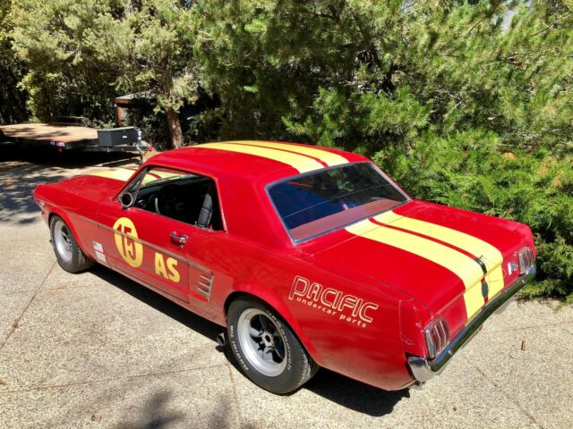 1966 K code Ford Mustang coupe VIN: 6R07K145224Car has log books going back to 1995. Complete MAECO Motorsports built car. Original mileage believed to be less than 34,000. Car comes with stock gauges. Original California blue plate car. Entire life in southern California. Registered with current tags.Balanced M-6010 BOSS 302 block 310C.I.RHS Ford 351 Windsor heads, Brzezinski prepared12.5 to 1 compressionBryant Racing 3.080 billet crankshaftCrane roller cam, custom 8,000 rpmCarillo connecting rods, length 5.400âJE forged pistons, 822735ARP head boltscoated Ford main bearings382-RH roller lifter setMcLeod 260530 full face 10.5â clutchHooker comp headersMelling HD oil pump9 quart oil panAluminum radiatorOil coolerApprox. 7 hours on original engine buildRepositioned upper control arms per MAECO spec.Lower control arms reinforced and modified w/inner spherical bearingsStrut rod spherical bearing kit620 lb. front springs145 lb. rear springsLarger front rotors10âx 2.5â rear brakesAdjustable front 1â sway barAdjustable panhard rod and reinforced mounting brackets w/steel heim jointsClose ratio Ford Toploader 4 speed - 7 events since rebuild, 4 events since inspectionHurst NASCAR shifterMustang 16:1 quick ratio steering box9â Ford rear w/locker 3:89 gearsFire bottle systemLights, brake lights, emergency flashers, and wipers working. No turn signalsQuick release steering wheelKirkey race seat - adjustableStock passenger seatBrand new 5 point harnessesFull carpet and headlinerRear seat delete4 point welded in rollbarNo heaterOn car are American Racing wheels with street tiresCar also comes with custom 15âx8â on Goodyear 6.00x15 race tiresNo fiberglassFuel cell replaced in the last couple yearsCar has mufflers but still loudNewer front brake padsAll glass still in carBattery in trunkIgnition cut-off on back of carTitled and currently registered under my name in California