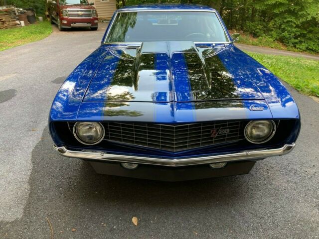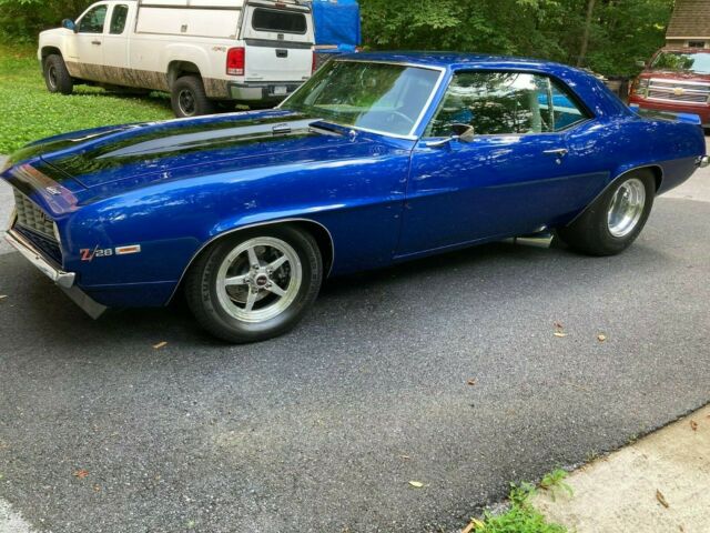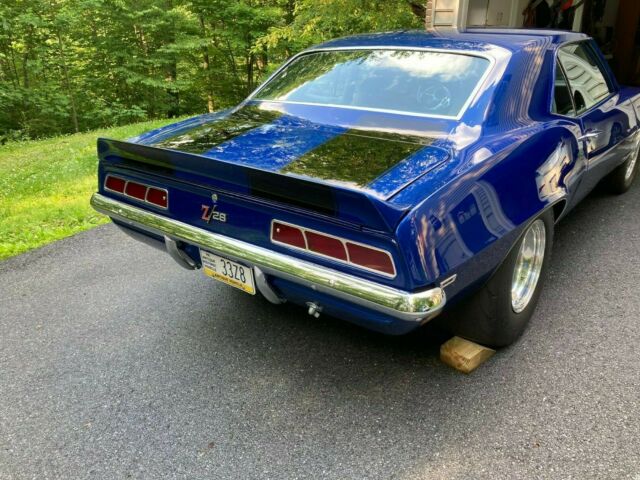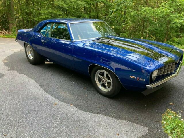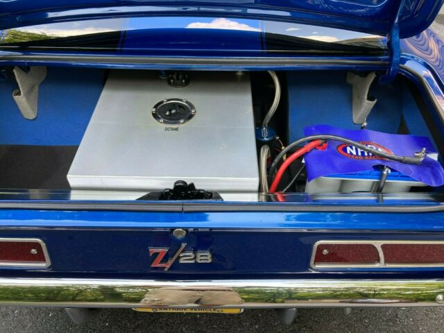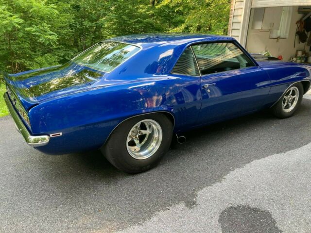Pro Street-style 1960 Chevrolet Camaro Z28 tribute â between the super-slick PPG 2006 Corvette Z06 LeMans Blue paint with its gloss black stripes and the massive big block engine, this frame off restored car is sure to make your heart beat fast!Under the hood of this beasts is a stout 502 CID V8 engine (built by Dinoâs Racing Engines), which is equipped with a Callies crank and forged Mahle 10.5:1 pistons. A set of ceramic coated Hooker headers funnel the spent fossils into a massive 3-inch stainless steel dual Magnaflow exhaust with huge polished stainless megaphones on its side exits. Fire it up, and it crackles and pops like a race car; but under normal driving, the sound is just right. Nail the gas, though, and youâll think youâre in a Nascar racer â which, in part, you are: the roll cage is a Nascar cage.The big 502âs power is sent to the rear end via a built reverse manual valve body 400 turbo transmission, controlled by a Hurst ratchet shifter. A stout Ford 9â rear houses a set of 3.73:1 gears, which makes this a wicked Camaro suitable for both street and strip. The 3rd-member is equipped with a 4-link setup, complete with adjustable coil-overs keep the Global West tubular upper and lower control arms properly damped, enhancing the handling. If one looks closely, theyâll notice that nearly everything underneath has been powder coated in a mottled gray finish, as have been the inner fenders in the engine bay, the core support for the radiator, and the tops of the valve covers⦠they match and look great!When it comes time to slow down, the driver will appreciate the four-piston SSBC Force10 brake calipers and drilled and slotted rotors up front; along with the four-piston Wilwood calipers and rotors out back. Thereâs even an adjustable brake proportioning valve, enabling the pilot to dial in the brake bias to their preference. Weld Racing aluminum wheels are at all 4 corners, shod by 165/80R-15 skinnies up front, and massive 315/60R-15 Mickey Thompson ET Drag Radials out back, which also fit nicely in the tubbed rear, and give it a real âProâ stance.Moving inward, the custom gray and black two-tone interior is done in a durable burlap cloth and features custom Z28 embroidered emblems in both the head rests and the rear parcel area. RCI 5-point racing harnesses deep driver and passenger securely tucked into their places, and a complete set of AutoMeter ProComp gauges, housed in a carbon fiber-look dash, help keep the driver informed of critical engine stats. Thereâs even a carbon fiber NOS bottle â which is there for show and is ready to be plumbed in should its new owner need a little extra top-end punch. Text Steve @ 484-345-9314