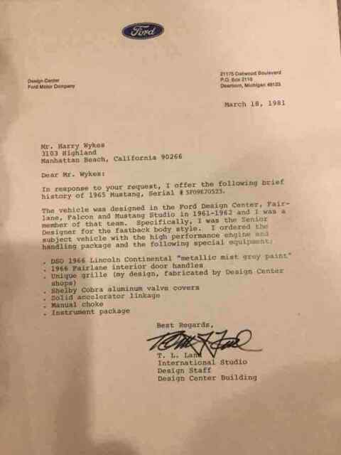 @import url(https://fonts.googleapis.com/css?family=Roboto); About this vehicle This 1965 Ford Mustang Fastback is a restored vehicle with updates to the exterior and interior. The owner has had it for 5+ years. The vehicle runs great. Seller's Notes Ford Mustang Fastback Factory HIPO K code 4 speed w/ only 1,203 miles In 1965, Ford made very few fastback k code cars, most were used by Carroll Shelby to make Shelby models. This particular car was owned by the senior designer for the Fastback body style at the Ford Factory by the name of T.L. Land. The vehicle was actually designed in the Ford Design Center Fairlane, Falcon, and Mustang studio in 1961-1962;. This is a restored car with the original VIN# stamped on the engine and transmission and has the original 9â rear end. This is a very special car with a unique history of having the actual designer customize this car in the Ford Production Plant for his own personal ride! This car comes with no color code. Donât miss your chance to win a true collectible! Must pay shipping. Exterior Interior Engine Created on the eBay Motors app