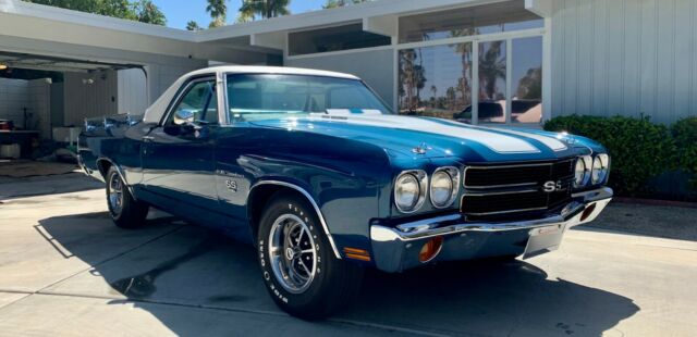 Absolute SHOW STOPPER 1970 El Camino SS 396. This iconic example sports a blue exterior with aggressive white racing stripes, a beautiful white vinyl top, and flawless white interior with the coveted door to door bench seat.This example has been enthusiast owned from the very beginning. My wife & I purchased this car in ...