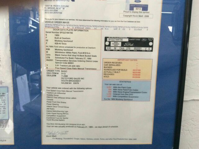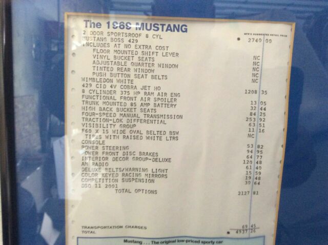 @import url(https://fonts.googleapis.com/css?family=Roboto); About this vehicle This 1969 Ford Mustang is an original. The owner has had it for 5+ years. The vehicle runs great and is mainly used for car shows. Seller's Notes Will sell all 3 together or separate Vehicle Details 1969 Boss 429. Recent engine refresh period correct boss 429. Top loader 4 speed with 3.91 Detroit Locker rear axle. Solid #2 car close to concourse. 33,000 original miles documented. Boyd documents including Deluxe Marti Report, original invoice, build sheet and much more. 2 sets wheels and tires. NO BUYER OR SELLER PREMIUM. $235,000. 1970 Boss 302. 1 or 262 built with rare 4.30 âdrag Packâ. W code rear axle. Great running correct boss engine with shaker hood scoop. Highly optioned with 8000 RPM Tach. In dash clock, folding rear seat, rear window lovers & rear deck spoiler. Excellent condition inside and out. No rust, damage, or problems vert rare 302. 40,000 miles. $80,000.00. 1971 Boss 351, 1 of 1806 built per verified Marti Report. Rare Grabber Green with black interior in near perfect shape. Powered by 351 solid lifter motor slightly resto mode. Top loader 4 speed with 3.91 traditional rear axle. Believed to be 69,000 miles. $50,000.00 Call or text Nick at 1 (509) 669-3374 for questions, specification or more information. Package deal for all 3,is available for $325,000.00 FIRM!!!! Cars have been together for last 15 years minimum Exterior Interior Engine Created on the eBay Motors app