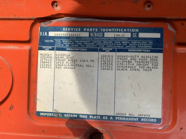 | Year: | 1972 | VIN (Vehicle Identification Number): | CKE182F164121 |