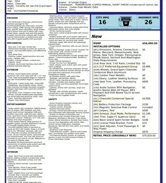 2012 Chevrolet Corvette Centennial Edition Z16 dry sump ls3 591 rear wheel horse power Available now is this rare Centennial edition corvette. Our car has had 2 owners and comes with a clean Florida title and clean car fax with no accidents....This 2012 Chevrolet Corvette Grand Sport is a Centennial Special Edition example that was produced to commemorate the 100th anniversary of Chevrolet. The car is finished in Carbon Flash Metallic over Ebony leather and powered by a 6.2-liter LS3 V8 paired with a six-speed manual. Body is in excellent condition paint is all original and has a ceramic coating applied. The original vinyl stripes show some aging but the car presents extremely nicely in person and in photos. Factory Satin Black 18Ⳡand 19ⳠGrand Sport wheels wear Louis Chevrolet center caps and are in good condition wrapped in older Michelin pilot sport tires. with red calipers. The car is equipped with magnetic selective ride control, traction control, and a tire pressure monitoring system. Our car is Z16 Performance Package, performance- oriented package for the Gymkhana/Autocross enthusiast; includes extra cooling, stiffer springs and stabilizer bars, specific shock absorbers, larger brakes with 6 piston front and 4 piston rear cross- drilled rotors, specific tires and Z16-specific 6-speed manual when ordered with 6-speed manual transmission. Additional equipment includes a limited-slip differential, the 3LT Preferred Equipment group, xenon headlights, a removable roof panel, Keyless Access with push-button start, dual-zone automatic climate control, Heads up display and a factory touchscreen infotainment system. Interior is in excellent condition. Seats show minimal to no wear and the car smells like new inside. This car has never been smoked in and has been enthusiast owned since new. All power functions inside the cabin work as they should. The pop off top is in excellent shape with no headliner issues. Car will come with 2 remotes all books and manuals and a printed out window sticker which totaled $70,620 or an additional $14,000 in options. Previous owner had the car supercharged at 15,000 miles with the C6 Novi 1500 kit for the LS3 engine. Package included the following..-Siemens 60lb injectors -Tial 50mm blow off valve-ECS catch can-6 rib pulley-Intercooler-NGK Spark plugs-Power steering cooler-160 degree thermostatAdditionally the car was fitted with kooks headers, cat delete and a progressive alcohol meth system. All in all the results were a impressive 591 WHP and 549 WTQ at 5100 RPM. The car is ECS tuned at a low and reliable 6 pounds of boost. Driving experience of this car is second to none. Driving characteristics are tight no creaks or sounds coming from anywhere. Between the exhaust note and whine of the supercharger and the blow off valve riding around with the top off is an absolute joy. More photos and videos available Serious inquiries call Eddie 305-527-6867 or Bernard 305-443-7626Follow us on Instagram for live updates!@rmcmiamiALL TRADES WELCOMED We also speak Deutsch and EspañolCan Ship (Insured) Anywhere Worldwide if Needed.Located in Miami, Florida 33126Financing Available with Approved Credit