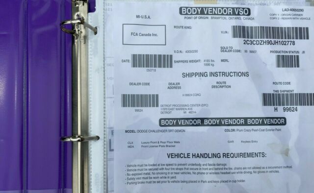 Comes with all the paperwork, the DEMON Box and yellow splitter protector. Seller will assist in shipping world wide after cleared funds. This car has 9 miles, not much more to add. Well optioned, see Window Sticker. Production # 2778. *** If you plan to buy and have LESS THAN 10 EBAY Transactions OR NEGITIVE FEEDBACK - CONTACT SELLER FIRST. The seller make no warranties, written or otherwise. Seller accepts wired / cleared funds. Title in hand. BUYER is 100% responsible for all transportation movement and related cost. Buyer is welcome to have PPI prior the bidding/offering to purchase car. Car has been recently reviewed/inspected in person by Certified Dodge /Chrysler Tech. DEPOSIT IS NOT REFUNDABLE. Please see the picture of the cars WINDOW STICKER included in this listing for detail of options/equipment, some are below:Comfort Audio Group-18 Speaker Harmon Kardon Audio System-Leather Seats w/Red Seat Belts-Unopened rear Seat Delete -Heated Front Seats -Ventilated Front Seats-60/40 Split Rear Folding Seat--Rear Armrest with Cup Holder-Heated Steering Wheel-Luxury Front and Rear Mats-Bright Pedals-Trunk Carpet Kit-Demon Vehicle Storage Package-Battery Manager by Mopar-Demon Crate (Opened for Picture)-Front Clip has Full PPF-Tinted WindowsSTANDARD -6.2L Supercharged HEMI V8 SRT Demon Engine-SRT Track Package-Drag Mode Suspension-Launch Assist-SRT Drive Modes-Parkview Rear Back Up Camera-Electric Power Steering-Electronic Stability Control/ Roll Mitigation-Demon Serialized Dash Plaque-Uconnect 4C NAV with 8.4 inch Display-Integrated Voice Command with Bluetooth-Google Android Auto Capable-Demon Air-Grabber Hood-Widebody Fender Flares-3 Keys-Purple matching Satin Car Cover +The Factory Cover-Window Sticker-Original Manuals and Factory DOODLES-Vehicle storage package -Battery Charger by Mopar-Demon Crate -MOPAR Authentication Package-Apple CarPlay Capable THIS IS YOUR CHANCE TO OWN a really low mileage DEMON !!