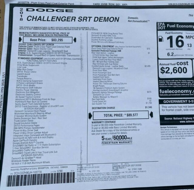 | Sub Model: | 9 mile SRT DEMON | Options: | See window sticker pic |