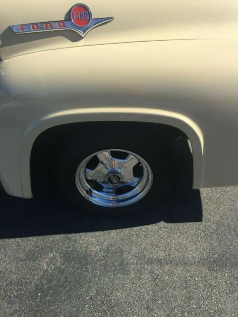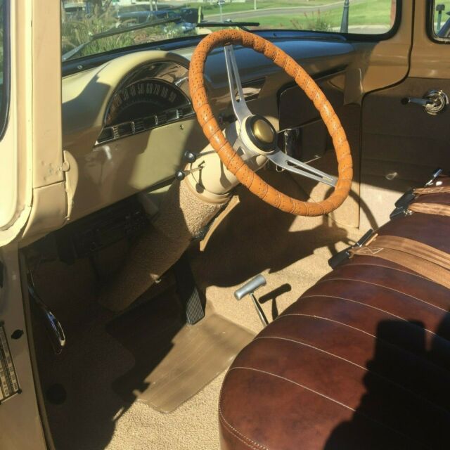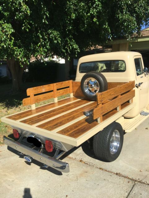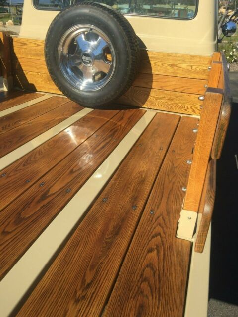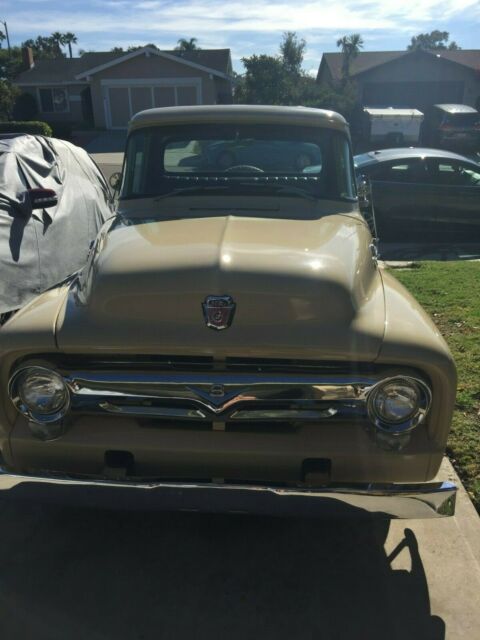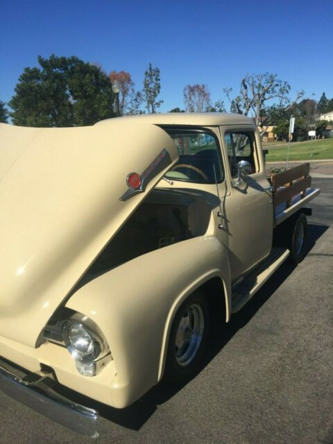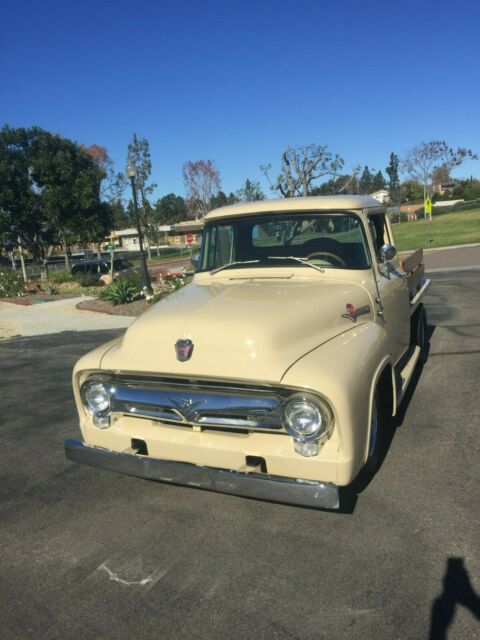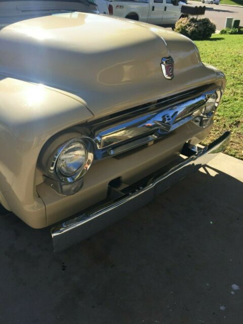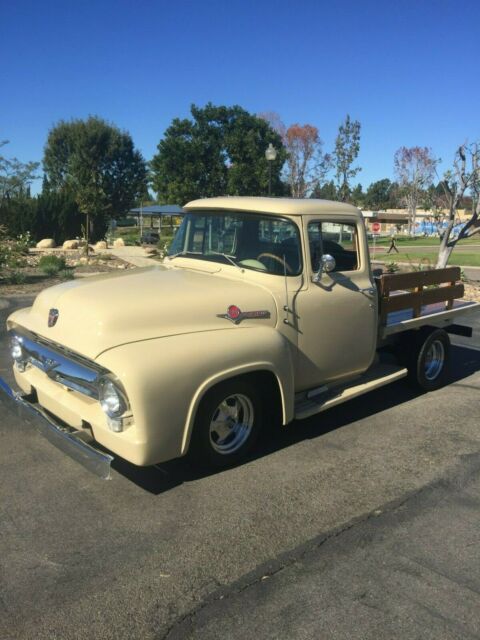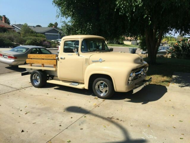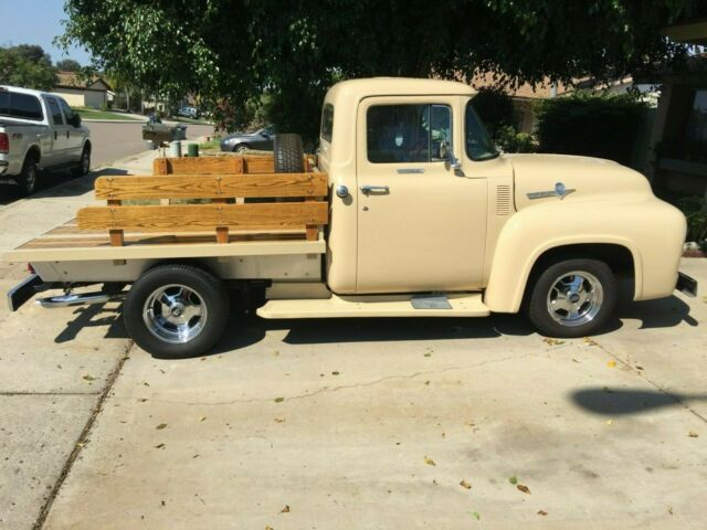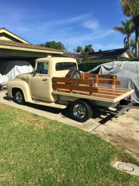 1956 Ford F100 custom oak stake bed truck. The truck has many custom upgrades. It has new cream/tan colored paint, newly refurbished wooden golden oak bed and a new TMI Interior including new carpet, kick-panels, etc. The paint and woodwork are very unique. Both paint and woodwork along with the new interior are excellent. The oak wood is stained with MinWax Golden Oak with Marine Spar Varnish. Underneath frame, exhaust, etc recently repainted. No rust ordings. The truck has a Plymouth Valariefront end with independent suspension and a Lincoln Versaile 9 positraction rear end with four wheel discbrakes and power assist brake booster and power steering. The front tires are P215/65R15 and the reartires are P295/50R15 which have basically zero miles on them. The engine is a Ford 390 cu inch with 1967mustang stock exhaust manifolds and old school ford valve covers. It has a newEdelbrock 4-barrel carburetor. It runsgreat with no issues. Few miles on motorwhich had previously been rebuilt. It isin top condition with no leaks. It isbacked up with a Ford C6 automatic transmission. As most Ford trannys it doeshave slight seepage out front seal, but it works perfectly. I am not sure of the ratio of the positiverear end but believe 3.0. Verycomfortable freeway driving. It hasGabriel Hijacker air shocks on the rear so the rear can be raised. It also hasa very stable trailer hitch and trailer wiring so you can tow comfortably withthe vehicle. Therefore, the spare is mounted in the bed behind the cab. Tiltsteering column. Seat has two small punctures on bottom which can be seen inpictures. Has a custom functioning nonleaking sky light. Has a tilt columnwith key on column. The rear undercarriageis framed with aluminum panels held together with airplane fasteners whicheffectively hides the springs, axles, etc. For sale for $44,000.Clear California title. Free local pickup. Buyer is responsiblefor arranging shipping but seller will assist if possible. Full funding (cash, cashiers check, etc) must be received before vehicle departs ownerâs residence. Vehicle forsale locally so listing may be removed at ownerâs discretion. Firm on listing price. No lowball offers, please. No consignment to dealers will be considered.