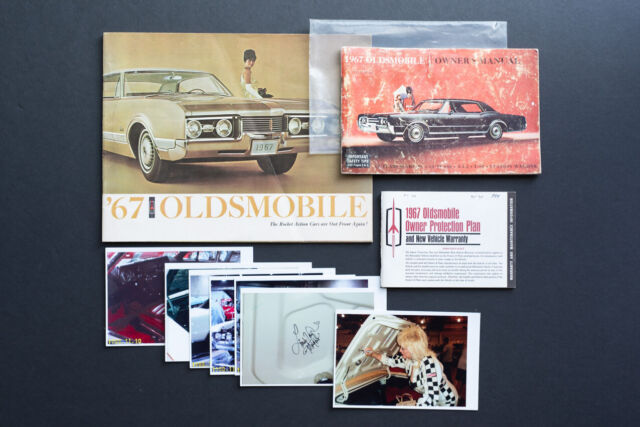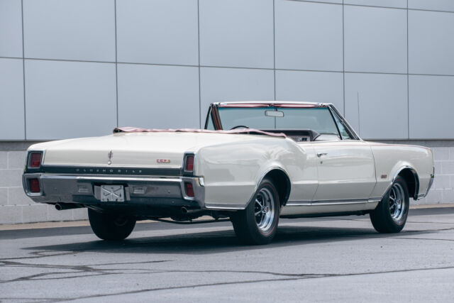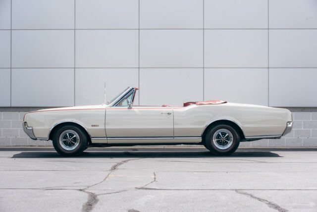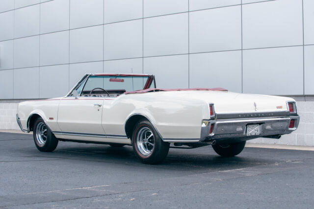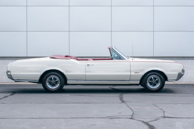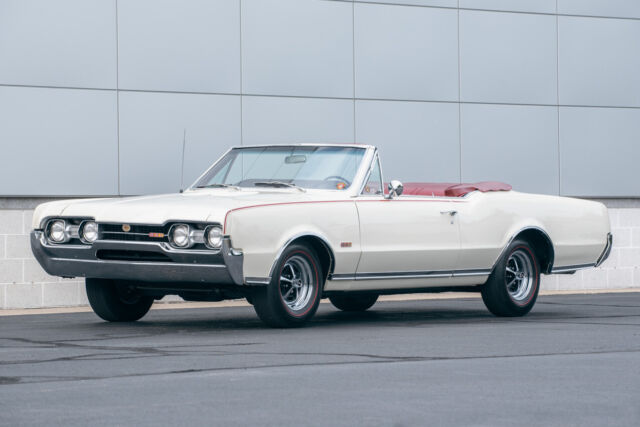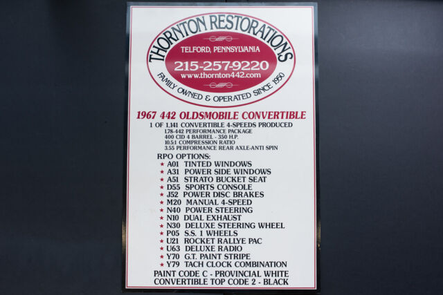 FOR SALE: 1967 Oldsmobile 442 ConvertibleVIN: 338677Z112709 Provincial White Exterior, Red Interior, Black Power Convertible Top; One of 1141 Convertible 4-speeds (M20) Produced; Many Options Including: M20 4-speed Manual, 442/L78 Performance Package, and Bucket Seats; Comprehensive Restoration by Previous Owner/Thornton Restorations in 2003/2004; Four-time AACA Award Winner; Maintained to Very High Standard/Serviced Annually. $84,900 This Olds 442 Convertible has been fully restored to factory spec and is in excellent condition. It has been cosmetically and mechanically maintained to a very high level by Fox Motorsports. Itâs been driven less than 50 miles in the last 10 years and serviced annually. A comprehensive restoration was performed by the previous owner with the help of known 442 specialist Thornton Restorations in 2003-2004. The car has won the following AACA awards: First Junior National Award â 2004 in Dublin, Ohio; Senior National Award â 2004 in Asheboro, North Carolina; First Preservation Award â 2005 in Jefferson, Indiana; Repeat Preservation Award â 2005 in Hershey, Pennsylvania. The 712 miles showing on the odometer are believed to be miles added since the restoration. Of special note, the underside of the trunk lid is signed by Linda Vaughn âMiss Hurstâ (w/photo documentation). Included with the car is the period-correct Protect-O-Plate, ownerâs manual, factory brochure, photos of the car with Linda Vaughn signing the trunk, and a metal âShow Placardâ listing the options, etc. This Olds 442 drives extremely well and has never seen snow/salt. Itâs always been stored in a climate-controlled environment (and on a battery trickle charger) when not in use. Service highlights include:-Regular detailing and other minor maintenance carried out, as needed.-11 fluid changes from 2008-2022 (oil, coolant, & brake fluidâlast serviced in May of 2022).-Engine â left bank rocker arms and all push rods replaced in 2013 (to replace incorrect parts).-Dash pad refinished in 2010 (by âJust Dashesâ). A major service in 2019 included:-Convertible top maintenance (hydraulic fluid change).-Clutch/Brake pedal assembly replaced (replaced incorrect parts).-Carburetor rebuilt (replated, new bushings, gaskets, etc.).-New rubber brake hoses & rear wheel cylinders. Front brake calipers rebuilt. Factory Options List:-Provincial White (paint code C)-Red Interior-Black Convertible Top (top code 2)-L78 Performance Package-400 CID/4-Barrel Carb â 350 HP-10.5:1 Compression Ratio-3.55 Performance Rear AxleâAnti Spin-A01 Tinted Windows-A31 Power Side Windows-A51 âStratoâ bucket seats-D55 Sports Console-J52 Power Disc Brakes-M20 4-speed-N40 Power Steering-N10 Dual Exhaust-N30 Deluxe Steering Wheel-P05 SS 1 Wheels-U21 Rocket Rallye Pac-U63 Deluxe Radio-Y70 GT Paint Stripe-Y79 Tach/Clock Combination $84,900Fox Motorsports manages automobile collections and is a registered dealer in Grand Rapids, Michigan. We specialize in the ongoing care, service, and restoration of fine automobiles of all eras, makes, and models. We cater to an exclusive collector based clientele and occasionally find ourselves in a position where a car is made available for sale. Please contact us for more information on this vehicle. +1 (616) 774-2640 / info@foxmotorsports.com