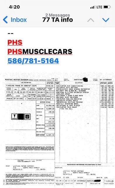 1977 Pontiac Trans Am. SE TA Smokey & The Bandit Edition. One of 6,476 built with a 403/Auto. Super clean, Rust Free, straight, not wrecked, Disc brakes, PS, PB, AC, Tilt, Tic-Toc-Tach, Shaker Hood, Hurst T-Tops (much more desirable and rarer than Fisher T-Tops), Crushed Velour interior (pretty rare as well), good tires, good glass including windshield, new Fender Flares included. 15" Honeycomb Wheels. Engine does not run and I haven't tried to turn it over or start it. Air Cleaner base is missing. I haven't checked to see if the numbers matching motor is there or not, but it doesn't look like it's been altered or changed. Factory colors are 19/19 (Starlight Black exterior and Black Cloth interior) just like the movie car!If you're looking for a great starting point for a Smokey and the Bandit restoration, this one is going to be very tough to beat!A $1000 non-refundable deposit is due upon auction close via Paypal. Balance is due by cash in person or bank wire within 7 days of auction close. No exceptions. Shipping will be on your dime. Car is located in Tooele, Utah 84074. It does roll and I can help load. If you have questions about shipping or something I forgot to cover try me at eight O one 244 six six 7 0.