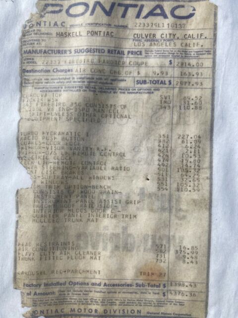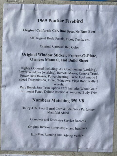 Watch Video Video will open in a new windowUsing the eBay App? Paste link into a browser window: [isdntekvideo] .ytvideo * { box-sizing:border-box; } .ytvideo { margin:.5em auto 40px auto; max-width:480px; font-family:arial; text-align:center; position:relative; min-height:120px; background-color:#555; } .ytvideo p { position:absolute; margin:0; color:white; background-color:rgba(0,0,0,.5); } .ytvideo .yt_hd { font-size:16px; width:100%; height:28px; padding-top:6px; text-align:left; top:0; left:0; padding-left:10px; overflow:hidden; } .ytvideo .yt_ft { font-size:12px; width:100%; bottom:0; left:0; } .ytvideo img { display:block; max-width:100%; border:0; } .ytvideo a:after { content:"\A0\25BA"; position:absolute; width:60px; height:40px; left:0; top:0; right:0; bottom:0; margin:auto; border:0; border-radius:10px; color:white; background:rgba(0,0,0,.6); font-size:24px; padding-top:11px; cursor:pointer; } .ytvideo a:hover:after { background:#CC181E; } .ytvideo .yt_inp { position:absolute; top:100%; left:0; width:100%; text-align:center; padding:.5em .2em; border:0; color:white; background: rgba(0,0,0,.7); } @media(max-device-width:960px){ .ytvideo { margin-bottom:60px; } .ytvideo .yt_inp { padding:1em .2em; } } ****CLICK ON LIVE VIDEO FOR WALK AROUND**** *****1969 PONTIAC FIREBIRD MATCHING NUMBER CAR A/C WITH DOCUMENTATION***** ****V8 350 POWER STEERING POWER BRAKE COLD A/C AUTOMATIC**** ********ITS BEST TO CALL US NOW WITH SERIOUS OFFER 954 937 8271 ASK FOR ALEX THANK YOU******* SHIPPING AVAILABLE TO MOST STATES $400 TO $500 CALL 954 937 8271 THANK YOU. ***PLEASE DON'T SEND TEXT MESSAGES OR LONG EMAILS IF YOU ARE A SERIOUS BUYER CALL 954 937 8271 THANK YOU*** ALL VEHICLES SOLD AS IS NO WARRANTIES OF ANY TYPE. INSPECTIONS ARE WELCOME BEFORE YOU BID NOT AFTER. ALL DESCRIPTION ARE BASED ON OUR BEST OPINION... ALL PAYMENTS AND DEPOSITS ARE NON REFUNDABLE YOU ARE BIDDING ON A USED VEHICLE NOT NEW EXPECT MINOR FLAWS THANK YOU.SELLER ASSUMES NO RESPONSIBILITY FOR ANY REPAIRS NEEDED AFTER THE VEHICLE IS DELIVERED. ALL SALES ARE FINAL. BY PLACING A BID ON THIS VEHICLE YOU ARE ENTERING INTO A LEGAL AND BINDING CONTRACT TO PURCHASE THE ABOVE-DESCRIBED VEHICLE. I RESERVE THE RIGHT TO CANCEL ALL EXISTING BIDS AND END THE AUCTION EARLY SHOULD THE ITEM NO LONGER BE AVAILABLE FOR SALE. PLEASE EMAIL ME WITH ANY SPECIFIC QUESTIONS.