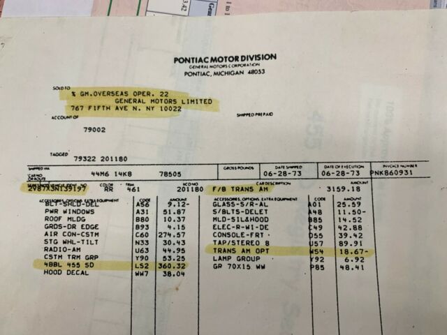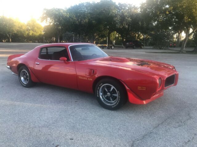 1973 Pontiac Trans Am Super Duty. Real X code SD car per vin number and PHS build sheet. 59400 actual documented miles. Correct date coded casting number 1973 490132 XD 455 Super Duty Engine. 4 speed manual muncie transmission. Originally an export car sold new in England. Factory Buccaneer Red over Black deluxe interior. A very high factory option car as per the factory invoice. Air Conditioning (ice cold), power windows,tilt steering, center console, am radio with 8 track tape, rear defogger (missing), power steering and power brakes as well as the Super Duty option. Restored in 1995 in England . Very clean body, clean floors, frame,unibody and trunk . The paint is old and could use the front rubber nose repainted as well as a little clear coat crazing on the passenger side quarter panel. The car looks great still as seen in the pictures and is an excellent driving car . I enjoy driving this car and if I was to take it to the next level I probably would not drive it as I would be scared . All the options work and the Air Conditioning has been recently serviced and blows cold. The car is a pleasure to drive . Starts easily,runs perfectly. No mechanical issues that I know of. The car is located in Hollywood Florida 33019 and can be inspected anytime before placing a bid. Please call me with any and all questions on my cell. Ian 773 551 5075. An immediate $1000 deposit through pay pal friends and family is required on acceptance by me of your offer. 10% deposit is required within 24 hours of accepted offer and full payment within 72 hours . Please call me with all questions prior to making an offer . The car is registered to me and being sold from my collection. Clean and clear title in my name in hand. Ian cell 773 551 5075 anytime